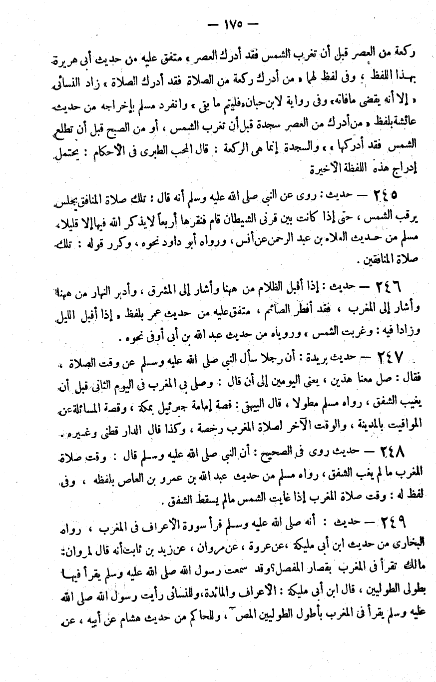 248 - حديث روي في الصحيح أن النبي صلى الله عليه و سلم قال وقت صلاة المغرب ما لم يغب الشفق رواه مسلم من حديث عبد الله بن عمرو بن العاص بلفظه وفي لفظ له وقت صلاة المغرب إذا غابت الشمس ما لم يسقط الشفق