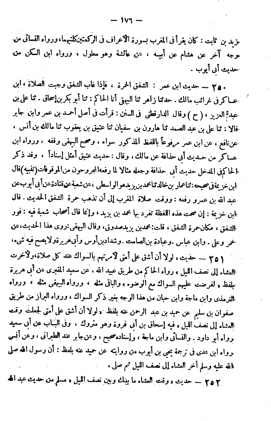 250 - حديث بن عمر الشفق الحمرة فإذا غاب الشفق وجبت الصلاة بن عساكر في غرائب مالك حدثنا زاهر ثنا البيهقي أنا الحاكم ثنا أبو بكر بن إسحاق ثنا علي بن عبد العزيز ح وقال الدارقطني في السنن قرأت في أصل أحمد بن عمر وابن جابر قالا ثنا علي بن عبد الصمد ثنا هارون بن سفيان ثنا عتيق بن يعقوب ثنا مالك بن أنس عن نافع عن بن عمر مرفوعا باللفظ المذكور سواء وصحح البيهقي وقفه ورواه بن عساكر من حديث أبي حذافة عن مالك وقال حديث عتيق أمثل إسنادا وقد ذكر الحاكم في المدخل حديث أبي حذافة وجعله مثالا لما رفعه المجروحون من الموقوفات