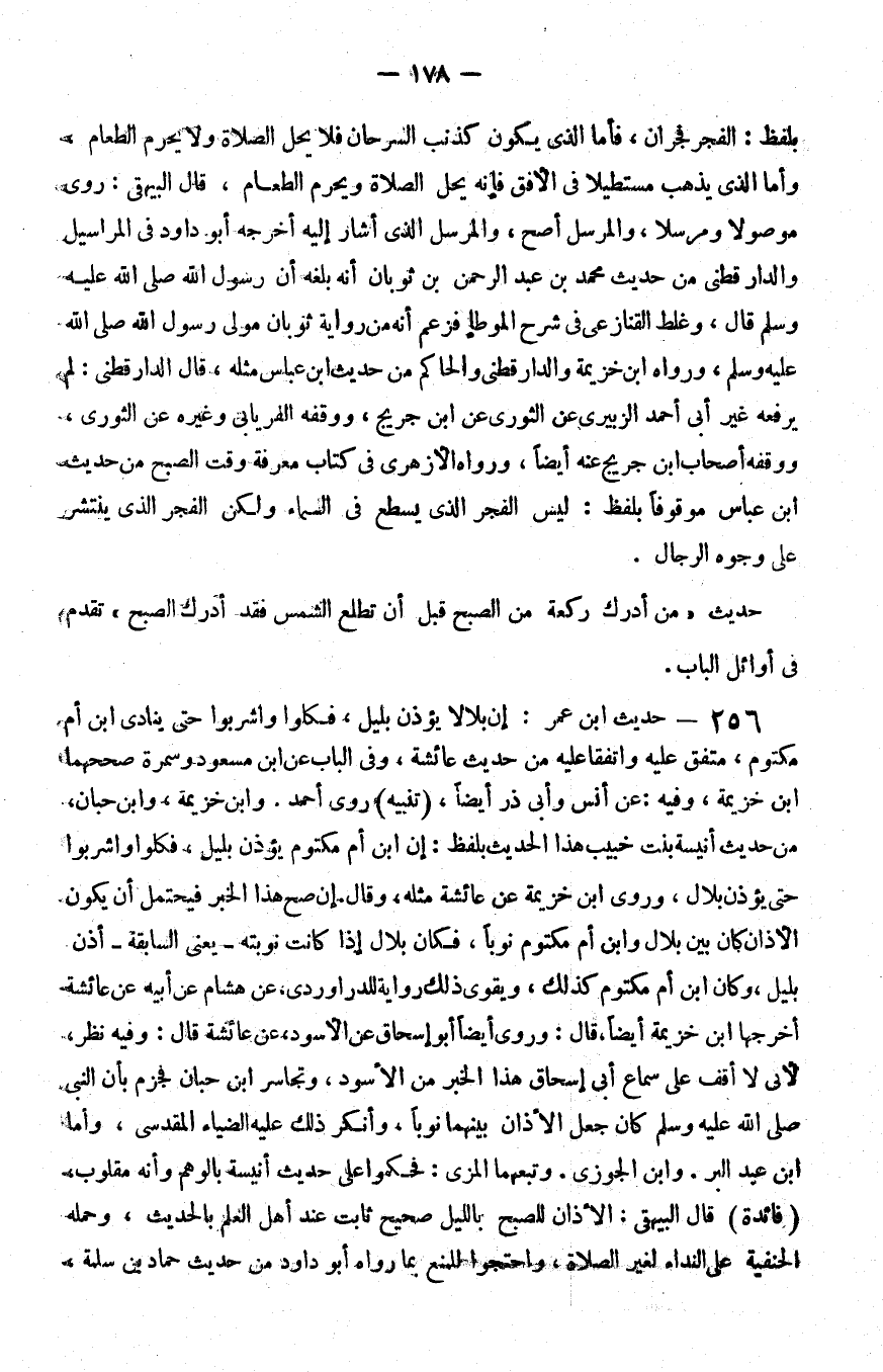 256 - حديث بن عمر إن بلالا يؤذن بليل فكلوا واشربوا حتى ينادي بن أم مكتوم متفق عليه واتفقا عليه من حديث عائشة وفي الباب عن بن مسعود وسمرة صححهما بن خزيمة وفيه عن أنس وأبي ذر أيضا