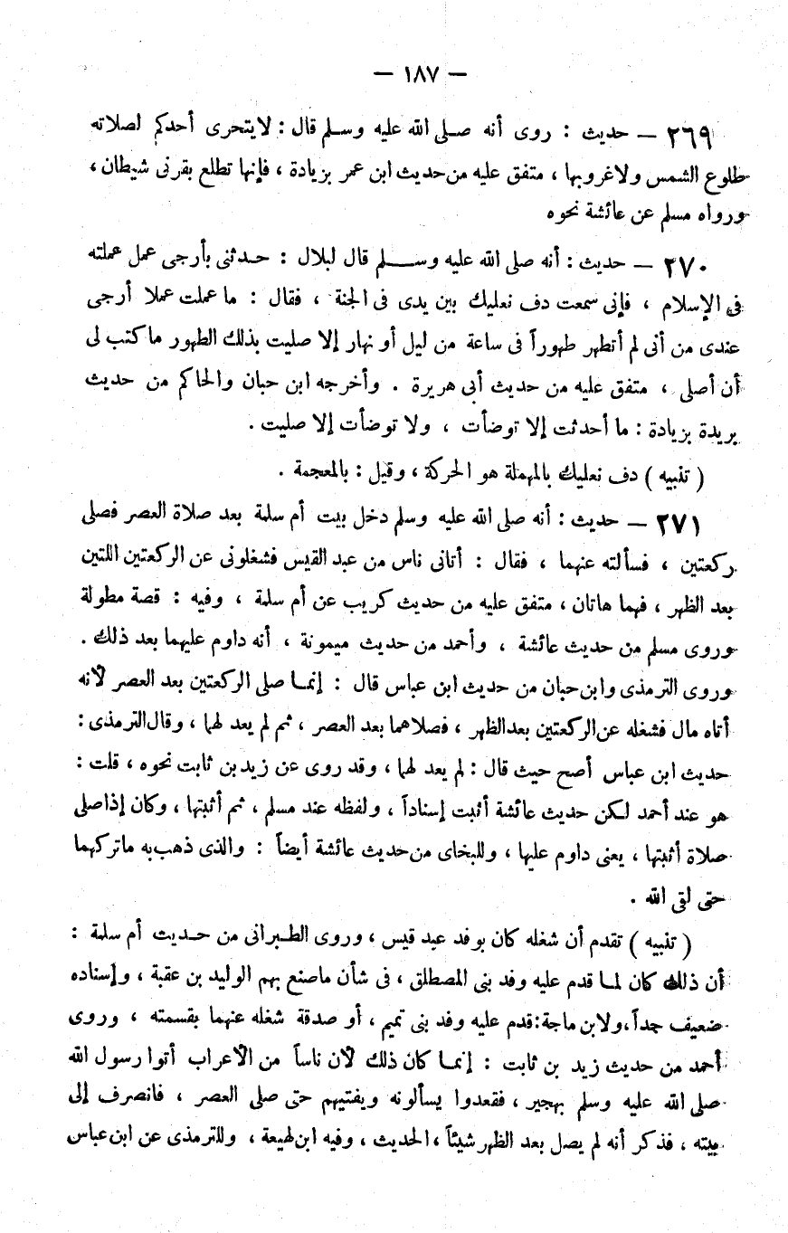 271 - حديث أنه صلى الله عليه و سلم دخل بيت أم سلمة بعد صلاة العصر فصلى ركعتين فسألته عنهما فقال أتاني ناس من عبد القيس فشغلوني عن الركعتين اللتين بعد الظهر فهما هاتان متفق عليه من حديث كريب عن أم سلمة وفيه قصة مطولة وروى مسلم من حديث عائشة وأحمد من حديث ميمونة أنه داوم عليهما بعد ذلك وروى الترمذي وابن حبان من حديث بن عباس قال إنما صلى الركعتين بعد العصر لأنه أتاه مال فشغله عن الركعتين بعد الظهر فصلاهما بعد العصر ثم لم يعد لهما وقال الترمذي حديث بن عباس أصح حيث قال لم يعد لهما وقد روي عن زيد بن ثابت نحوه قلت هو عند أحمد لكن حديث عائشة أثبت إسنادا ولفظه عند مسلم ثم أثبتها وكان إذا صلى صلاة أثبتها يعني داوم عليها وللبخاري من حديث عائشة أيضا والذي ذهب به ما تركهما حتى لقي الله