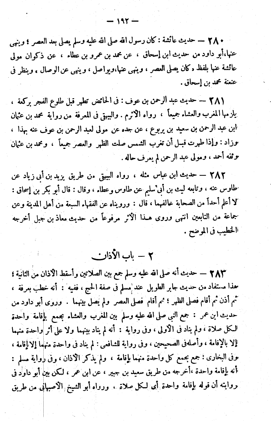 283 - حديث أنه صلى الله عليه و سلم جمع بين الصلاتين وأسقط الأذان من الثانية هذا مستفاد من حديث جابر الطويل عند مسلم في صفة الحج ففيه أنه خطب بغرفة ثم أذن ثم أقام فصلى الظهر ثم أقام فصلى العصر ولم يصل بينهما وروى أبو داود من حديث بن عمر جمع النبي صلى الله عليه و سلم بين المغرب والعشاء بجمع بإقامة واحدة لكل صلاة ولم يناد في الأولى وفي رواية أنه لم يناد بينهما ولا على أثر واحدة منهما إلا بالإقامة وأصله في الصحيحين وفي رواية للشافعي لم يناد في واحدة منهما إلا بإقامة وفي البخاري جمع بجمع كل واحدة منهما بإقامة ولم يذكر الأذان وفي رواية مسلم أنه بإقامة واحدة أخرجه من طريق سعيد بن جبير عن بن عمر لكن بين أبو داود في روايته أن قوله بإقامة واحدة أي لكل صلاة ورواه أبو الشيخ الأصبهاني من طريق