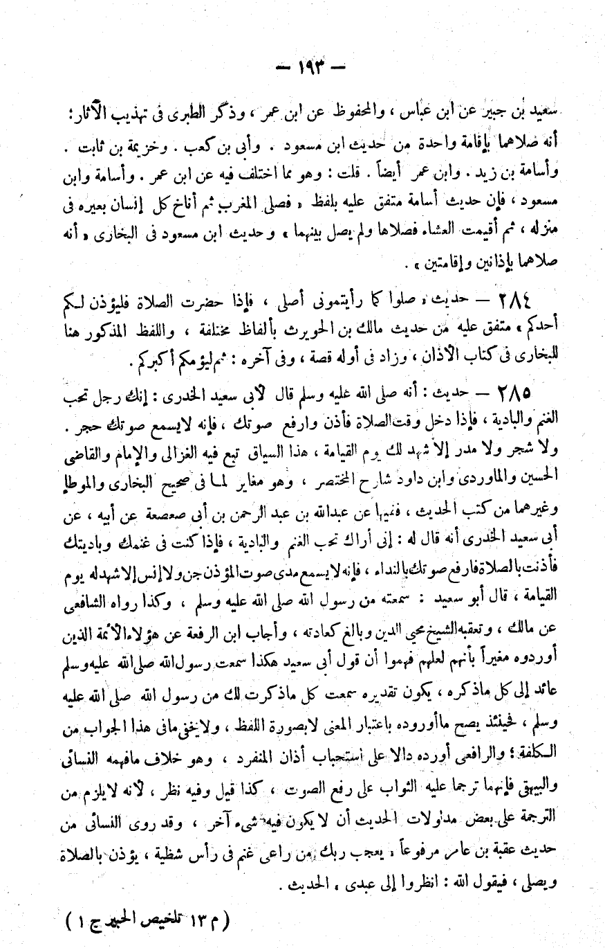 285 - حديث أنه صلى الله عليه و سلم قال لأبي سعيد الخدري إنك رجل تحب الغنم والبادية فإذا دخل وقت الصلاة فأذن وارفع صوتك فإنه لا يسمع صوتك حجر ولا شجر ولا مدر إلا شهد لك يوم القيامة هذا السياق تبع فيه الغزالي والإمام والقاضي الحسين والماوردي وابن داود شارح المختصر وهو مغاير لما في صحيح البخاري والموطإ وغيرهما من كتب الحديث ففيها عن عبد الله بن عبد الرحمن بن أبي صعصعة عن أبيه عن أبي سعيد الخدري أنه قال له إني أراك تحب الغنم والبادية فإذا كنت في غنمك وباديتك فأذنت بالصلاة فارفع صوتك بالنداء فإنه لا يسمع مدى صوت المؤذن جن ولا إنس إلا شهد له يوم القيامة قال أبو سعيد سمعته من رسول الله صلى الله عليه و سلم وكذا رواه الشافعي عن مالك وتعقبه الشيخ محيي الدين وبالغ كعادته وأجاب بن الرفعة عن هؤلاء الأئمة الذين أوردوه مغيرا بأنهم لعلهم فهموا أن قول أبي سعيد هكذا سمعت رسول الله صلى الله عليه و سلم عائد إلى كل ما ذكره يكون تقديره سمعت كل ما ذكرت لك من رسول الله صلى الله عليه و سلم فحينئذ يصح ما أوردوه باعتبار المعنى لا بصورة اللفظ ولا يخفى ما في هذا الجواب من الكلفة والرافعي أورده دالا على استحباب أذان المنفرد وهو خلاف ما فهمه النسائي والبيهقي فإنهما ترجما عليه الثواب على رفع الصوت كذا قيل وفيه نظر لأنه لا يلزم من الترجمة على بعض مدلولات الحديث أن لا يكون فيه شيء آخر وقد روى النسائي من حديث عقبة بن عامر مرفوعا يعجب ربك من راعي غنم في رأس شظية يؤذن بالصلاة ويصلي فيقول الله انظروا إلى عبدي الحديث