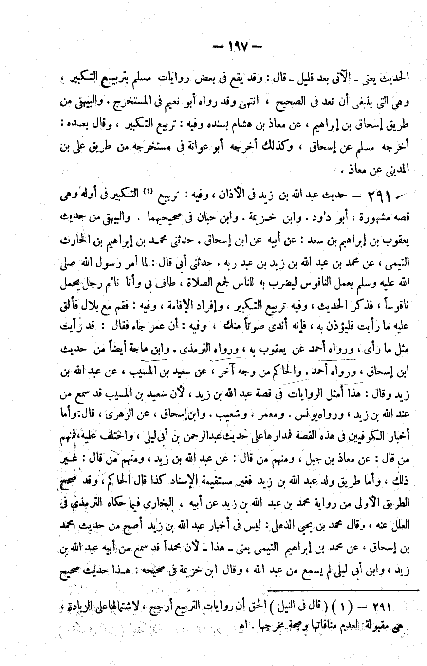 291 - حديث عبد الله بن زيد في الأذان وفيه تربيع 1 التكبير في أوله وهي قصة مشهورة أبو داود وابن خزيمة وابن حبان في صحيحيهما والبيهقي من حديث يعقوب بن إبراهيم بن سعد عن أبيه عن بن إسحاق حدثني محمد بن إبراهيم بن الحارث التيمي عن محمد بن عبد الله بن زيد بن عبد ربه حدثني أبي قال لما أمر رسول الله صلى الله عليه و سلم بعمل الناقوس ليضرب به للناس لجمع الصلاة طاف بي وأنا نائم رجل يحمل ناقوسا فذكر الحديث وفيه تربيع التكبير وإفراد الإقامة وفيه فقم مع بلال فألق عليه ما رأيت فليؤذن به فإنه أندى صوتا منك وفيه أن عمر جاء فقال قد رأيت مثل ما رأى ورواه أحمد عن يعقوب به ورواه الترمذي وابن ماجة أيضا من حديث بن إسحاق ورواه أحمد والحاكم من وجه آخر عن سعيد بن المسيب عن عبد الله بن زيد وقال هذا أمثل الروايات في قصة عبد الله بن زيد لأن سعيد بن المسيب قد سمع من عبد الله بن زيد ورواه يونس ومعمر وشعيب وابن إسحاق عن الزهري قال وأما أخبار الكوفيين في هذه القصة فمدارها على حديث عبد الرحمن بن أبي ليلى واختلف عليه فمنهم من قال عن معاذ بن جبل ومنهم من قال عن عبد الله بن زيد ومنهم من قال غير ذلك وأما طريق ولد عبد الله بن زيد فغير مستقيمة الإسناد كذا قال الحاكم وقد صحح الطريق الأولى من رواية محمد بن عبد الله بن زيد عن أبيه البخاري فيما حكاه الترمذي في العلل عنه وقال محمد بن يحيى الذهلي ليس في أخبار عبد الله بن زيد أصح من حديث محمد بن إسحاق عن محمد بن إبراهيم التيمي يعني هذا لأن محمدا قد سمع من أبيه عبد الله بن زيد وابن أبي ليلى لم يسمع من عبد الله وقال بن خزيمة في صحيحه هذا حديث صحيح