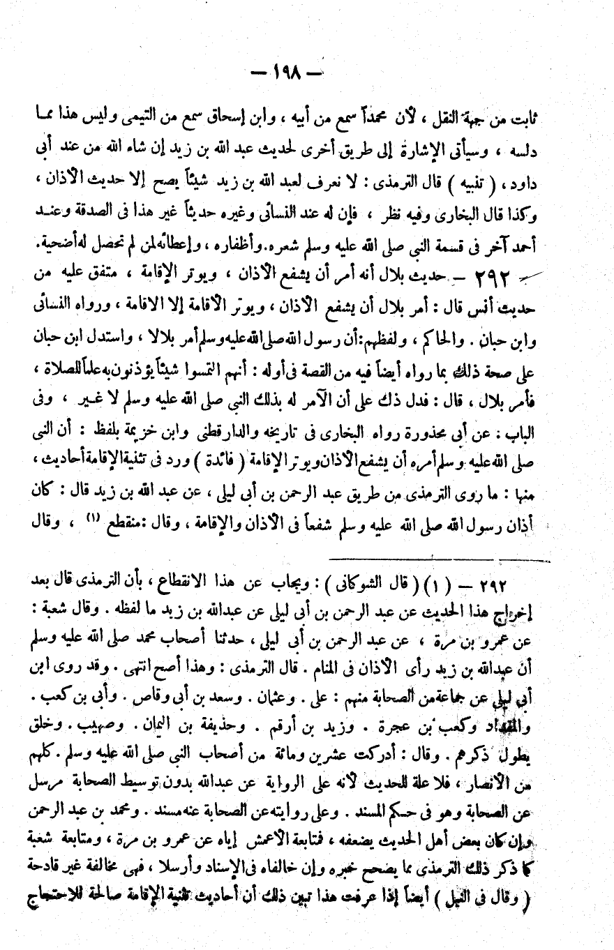 292 - حديث بلال أنه أمر أن يشفع الأذان ويوتر الإقامة متفق عليه من حديث أنس قال أمر بلال أن يشفع الأذان ويوتر الإقامة إلا الإقامة ورواه النسائي وابن حبان والحاكم ولفظهم أن رسول الله صلى الله عليه و سلم أمر بلالا واستدل بن حبان على صحة ذلك بما رواه أيضا فيه من القصة في أوله أنهم التمسوا شيئا يؤذنون به علما للصلاة فأمر بلال قال فدل ذلك على أن الآمر له بذلك النبي صلى الله عليه و سلم لا غير وفي الباب عن أبي محذورة رواه البخاري في تاريخه والدارقطني وابن خزيمة بلفظ أن النبي صلى الله عليه و سلم أمره أن يشفع الأذان ويوتر الإقامة