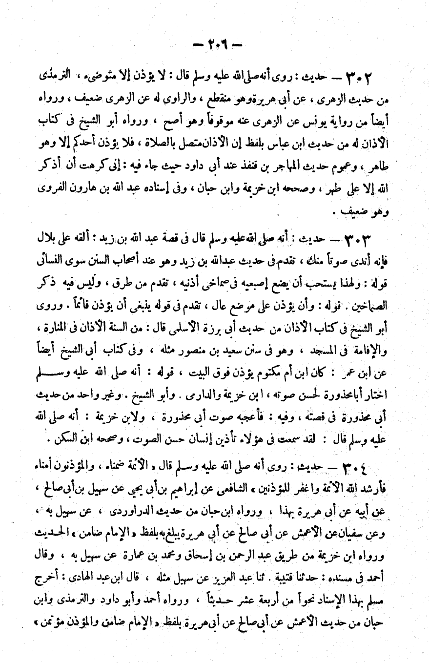 302 - حديث روي أنه صلى الله عليه و سلم قال لا يؤذن إلا متوضئ الترمذي من حديث الزهري عن أبي هريرة وهو منقطع والراوي له عن الزهري ضعيف ورواه أيضا من رواية يونس عن الزهري عنه موقوفا وهو أصح ورواه أبو الشيخ في كتاب الأذان له من حديث بن عباس بلفظ إن الأذان متصل بالصلاة فلا يؤذن أحدكم إلا وهو طاهر وعموم حديث المهاجر بن قنفذ عند أبي داود حيث جاء فيه إني كرهت أن أذكر الله إلا على طهر وصححه بن خزيمة وابن حبان وفي إسناده عبد الله بن هارون الفروي وهو ضعيف