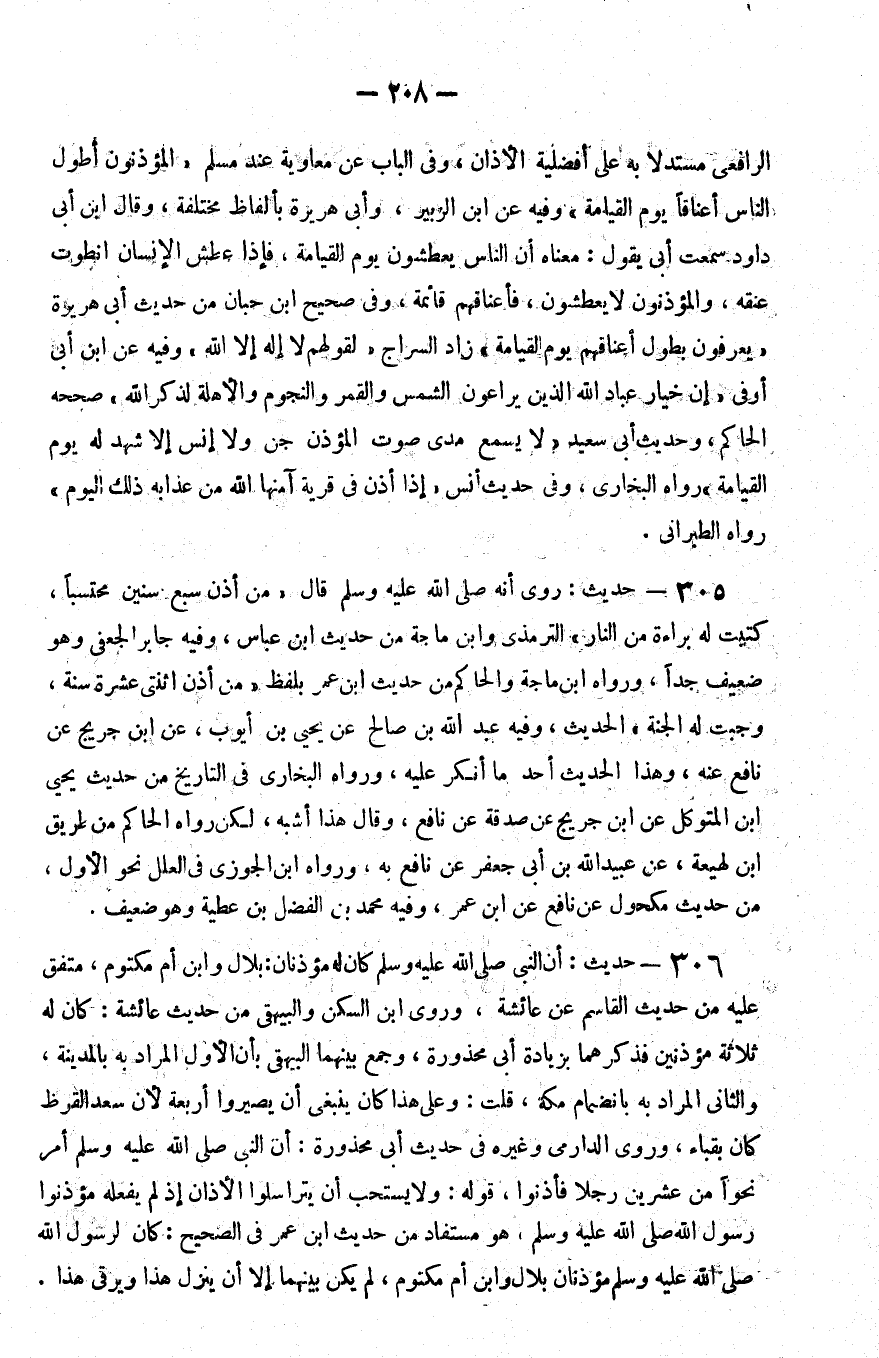 305 - حديث روي أنه صلى الله عليه و سلم قال من أذن سبع سنين محتسبا كتبت له براءة من النار الترمذي وابن ماجة من حديث بن عباس وفيه جابر الجعفي وهو ضعيف جدا ورواه بن ماجة والحاكم من حديث بن عمر بلفظ من أذن اثنتي عشرة سنة وجبت له الجنة الحديث وفيه عبد الله بن صالح عن يحيى بن أيوب عن بن جريج عن نافع عنه وهذا الحديث أحد ما أنكر عليه ورواه البخاري في التاريخ من حديث يحيى بن المتوكل عن بن جريج عن صدقة عن نافع وقال هذا أشبه لكن رواه الحاكم من طريق بن لهيعة عن عبيد الله بن أبي جعفر عن نافع به ورواه بن الجوزي في العلل نحو الأول من حديث مكحول عن نافع عن بن عمر وفيه محمد بن الفضل بن عطية وهو ضعيف
