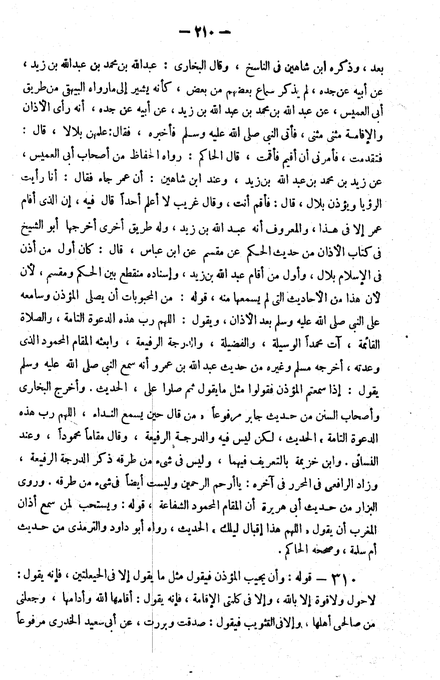 بعد وذكره بن شاهين في الناسخ وقال البخاري عبد الله بن محمد بن عبد الله بن زيد عن أبيه عن جده لم يذكر سماع بعضهم من بعض كأنه يشير إلى ما رواه البيهقي من طريق أبي العميس عن عبد الله بن محمد بن عبد الله بن زيد عن أبيه عن جده أنه رأى الأذان والإقامة مثنى مثنى فأتى النبي صلى الله عليه و سلم فأخبره فقال علمهن بلالا قال فتقدمت فأمرني أن أقيم فأقمت قال الحاكم رواه الحفاظ من أصحاب أبي العميس عن زيد بن محمد بن عبد الله بن زيد وعند بن شاهين أن عمر جاء فقال أنا رأيت الرؤيا ويؤذن بلال قال فأقم أنت وقال غريب لا أعلم أحدا قال فيه إن الذي أقام عمر إلا في هذا والمعروف أنه عبد الله بن زيد وله طريق أخرى أخرجها أبو الشيخ في كتاب الأذان من حديث الحكم عن مقسم عن بن عباس قال كان أول من أذن في الإسلام بلال وأول من أقام عبد الله بن زيد وإسناده منقطع بين الحكم ومقسم لأن هذا من الأحاديث التي لم يسمعها منه قوله من المحبوبات أن يصلي المؤذن وسامعه على النبي صلى الله عليه و سلم بعد الأذان ويقول اللهم رب هذه الدعوة التامة والصلاة القائمة آت محمدا الوسيلة والفضيلة والدرجة الرفيعة وابعثه المقام المحمود الذي وعدته أخرجه مسلم وغيره من حديث عبد الله بن عمرو أنه سمع النبي صلى الله عليه و سلم يقول