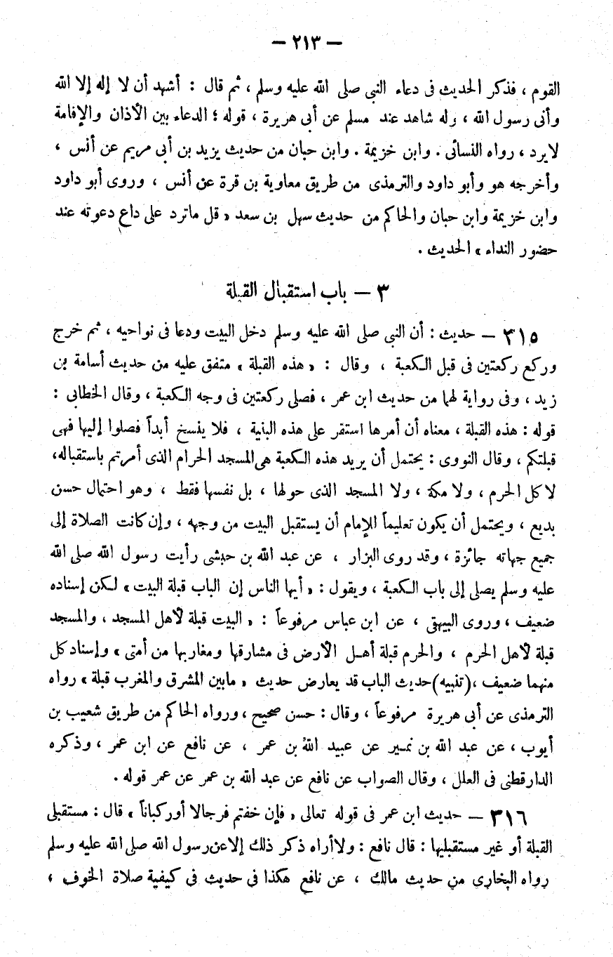 315 - حديث أن النبي صلى الله عليه و سلم دخل البيت ودعا في نواحيه ثم خرج وركع ركعتين في قبل الكعبة وقال هذه القبلة متفق عليه من حديث أسامة بن زيد وفي رواية لهما من حديث بن عمر فصلى ركعتين في وجه الكعبة وقال الخطابي قوله هذه القبلة معناه أن أمرها استقر على هذه البنية فلا ينسخ أبدا فصلوا إليها فهي قبلتكم وقال النووي يحتمل أن يريد هذه الكعبة هي المسجد الحرام الذي أمرتم باستقباله لا كل الحرم ولا مكة ولا المسجد الذي حولها بل نفسها فقط وهو احتمال حسن بديع ويحتمل أن يكون تعليما للإمام أن يستقبل البيت من وجهه وإن كانت الصلاة إلى جميع جهاته جائزة وقد روى البزار عن عبد الله بن حبشي رأيت رسول الله صلى الله عليه و سلم يصلى إلى باب الكعبة ويقول أيها الناس إن الباب قبلة البيت لكن إسناده ضعيف وروى البيهقي عن بن عباس مرفوعا البيت قبلة لأهل المسجد والمسجد قبلة لأهل الحرم والحرم قبلة أهل الأرض في مشارقها ومغاربها من أمتي وإسناد كل منهما ضعيف