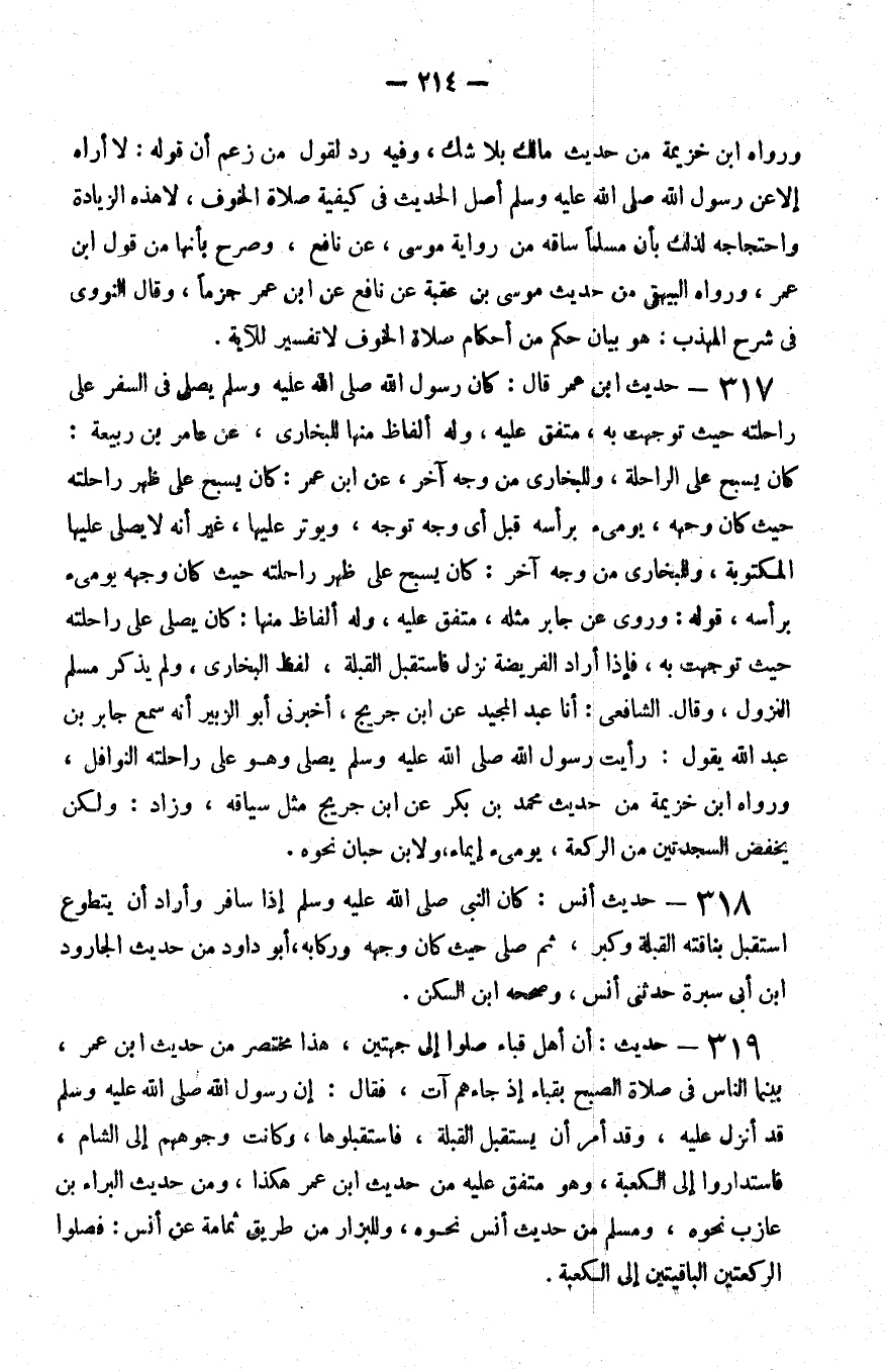 317 - حديث بن عمر قال كان رسول الله صلى الله عليه و سلم يصلي في السفر على راحلته حيث توجهت به متفق عليه وله ألفاظ منها للبخاري عن عامر بن ربيعة كان يسبح على الراحلة وللبخاري من وجه آخر عن بن عمر كان يسبح على ظهر راحلته حيث كان وجهه يومئ برأسه قبل أي وجه توجه ويوتر عليها غير أنه لا يصلي عليها المكتوبة وللبخاري من وجه آخر كان يسبح على ظهر راحلته حيث كان وجهه يومئ برأسه قوله وروى عن جابر مثله متفق عليه وله ألفاظ منها كان يصلي على راحلته حيث توجهت به فإذا أراد الفريضة نزل فاستقبل القبلة لفظ البخاري ولم يذكر مسلم النزول وقال الشافعي أنا عبد المجيد عن بن جريج أخبرني أبو الزبير أنه سمع جابر بن عبد الله يقول رأيت رسول الله صلى الله عليه و سلم يصلي وهو على راحلته النوافل ورواه بن خزيمة من حديث محمد بن بكر عن بن جريج مثل سياقه وزاد ولكن يخفض السجدتين من الركعة يومئ إيماء ولابن حبان نحوه