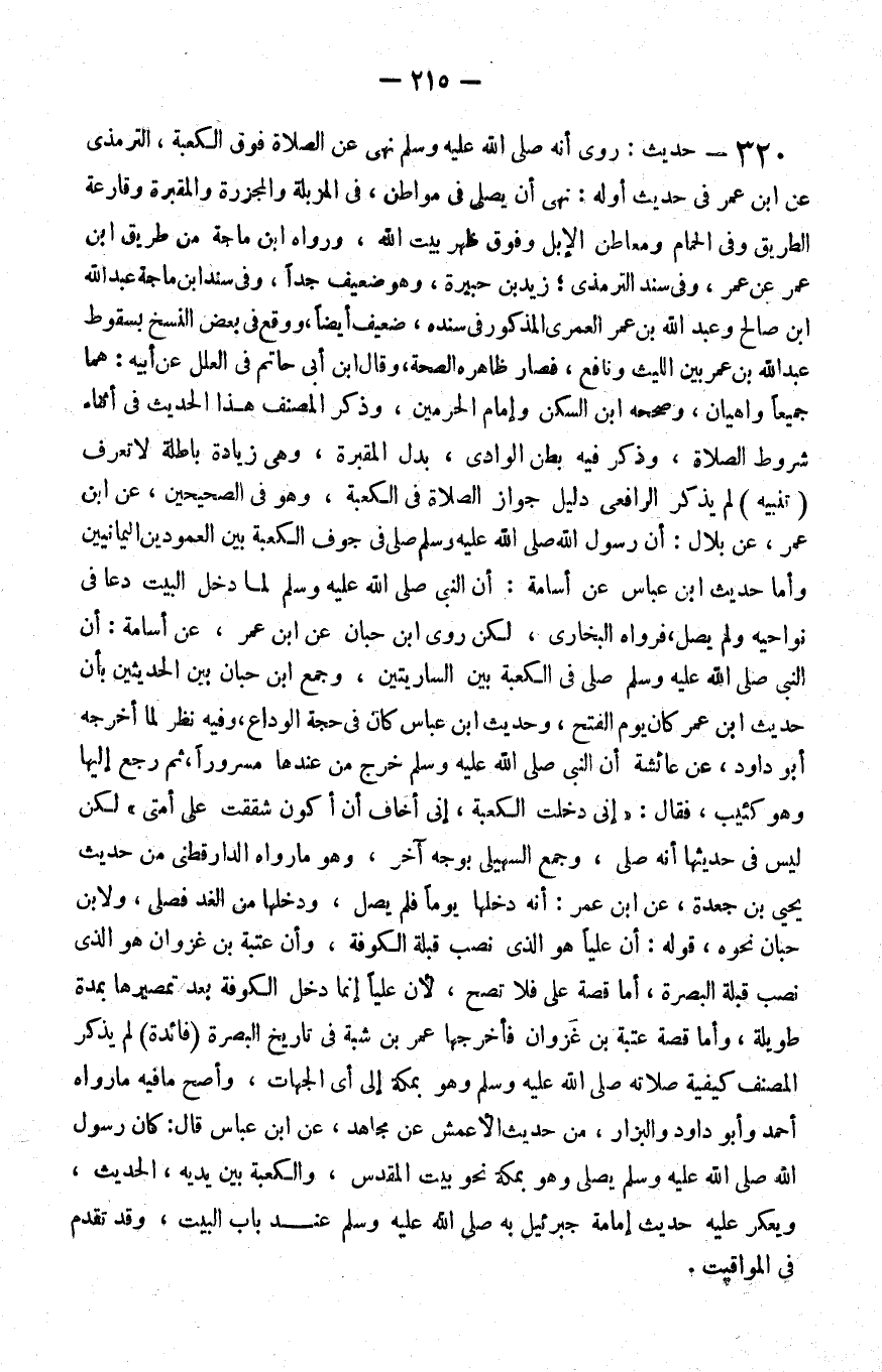 320 - حديث روي أنه صلى الله عليه و سلم نهى عن الصلاة فوق الكعبة الترمذي عن بن عمر في حديث أوله نهى أن يصلى في مواطن في المزبلة والمجزرة والمقبرة وقارعة الطريق وفي الحمام ومعاطن الإبل وفوق ظهر بيت الله ورواه بن ماجة من طريق بن عمر عن عمر وفي سند الترمذي زيد بن حبيرة وهو ضعيف جدا وفي سند بن ماجة عبد الله بن صالح وعبد الله بن عمر العمري المذكور في سنده ضعيف أيضا ووقع في بعض النسخ بسقوط عبد الله بن عمر بين الليث ونافع فصار ظاهره الصحة وقال بن أبي حاتم في العلل عن أبيه هما جميعا واهيان وصححه بن السكن وإمام الحرمين وذكر المصنف هذا الحديث في أثناء شروط الصلاة وذكر فيه بطن الوادي بدل المقبرة وهو في الصحيحين عن بن عمر عن بلال أن رسول الله صلى الله عليه و سلم صلى في جوف الكعبة بين العمودين اليمانيين وأما حديث بن عباس عن أسامة أن النبي صلى الله عليه و سلم لما دخل البيت دعا في نواحيه ولم يصل فرواه البخاري لكن روى بن حبان عن بن عمر عن أسامة أن النبي صلى الله عليه و سلم صلى في الكعبة بين الساريتين وجمع بن حبان بين الحديثين بأن حديث بن عمر كان يوم الفتح وحديث بن عباس كان في حجة الوداع وفيه نظر لما أخرجه أبو داود عن عائشة أن النبي صلى الله عليه و سلم خرج من عندها مسرورا ثم رجع إليها وهو كئيب فقال إني دخلت الكعبة إني أخاف أن أكون شققت على أمتي لكن ليس في حديثها أنه صلى وجمع السهيلي بوجه آخر وهو ما رواه الدارقطني من حديث يحيى بن جعدة عن بن عمر أنه دخلها يوما فلم يصل ودخلها من الغد فصلى ولابن حبان نحوه قوله أن عليا هو الذي نصب قبلة الكوفة وأن عتبة بن غزوان هو الذي نصب قبلة البصرة أما قصة علي فلا تصح لأن عليا إنما دخل الكوفة بعد تمصيرها بمدة طويلة وأما قصة عتبة بن غزوان فأخرجها عمر بن شبة في تاريخ البصرة