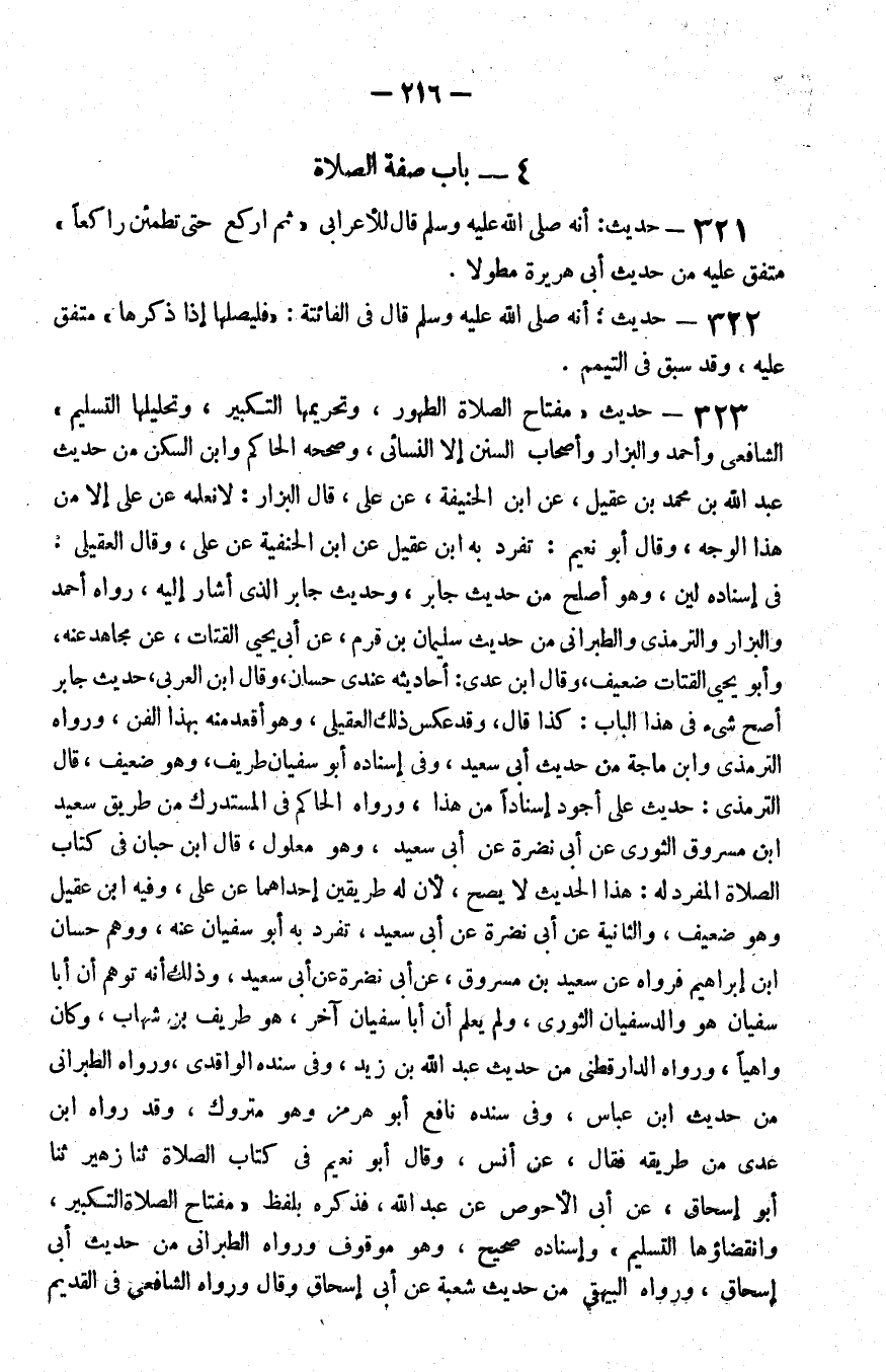 323 - حديث مفتاح الصلاة الطهور وتحريمها التكبير وتحليلها التسليم الشافعي وأحمد والبزار وأصحاب السنن إلا النسائي وصححه الحاكم وابن السكن من حديث عبد الله بن محمد بن عقيل عن بن الحنيفة عن علي قال البزار لا نعلمه عن علي إلا من هذا الوجه وقال أبو نعيم تفرد به بن عقيل عن بن الحنفية عن علي وقال العقيلي في إسناده لين وهو أصلح من حديث جابر وحديث جابر الذي أشار إليه رواه أحمد والبزار والترمذي والطبراني من حديث سليمان بن قرم عن أبي يحيى القتات عن مجاهد عنه وأبو يحيى القتات ضعيف وقال بن عدي أحاديثه عندي حسان وقال بن العربي حديث جابر أصح شيء في هذا الباب كذا قال وقد عكس ذلك العقيلي وهو أقعد منه بهذا الفن ورواه الترمذي وابن ماجة من حديث أبي سعيد وفي إسناده أبو سفيان طريف وهو ضعيف قال الترمذي حديث علي أجود إسنادا من هذا ورواه الحاكم في المستدرك من طريق سعيد بن مسروق الثوري عن أبي نضرة عن أبي سعيد وهو معلول قال بن حبان في كتاب الصلاة المفرد له هذا الحديث لا يصح لأن له طريقين إحداهما عن علي وفيه بن عقيل وهو ضعيف والثانية عن أبي نضرة عن أبي سعيد تفرد به أبو سفيان عنه ووهم حسان بن إبراهيم فرواه عن سعيد بن مسروق عن أبي نضرة عن أبي سعيد وذلك أنه توهم أن أبا سفيان هو والد سفيان الثوري ولم يعلم أن أبا سفيان آخر هو طريف بن شهاب وكان واهيا ورواه الدارقطني من حديث عبد الله بن زيد وفي سنده الواقدي ورواه الطبراني من حديث بن عباس وفي سنده نافع أبو هرمز وهو متروك وقد رواه بن عدي من طريقه فقال عن أنس وقال أبو نعيم في كتاب الصلاة ثنا زهير ثنا أبو إسحاق عن أبي الأحوص عن عبد الله فذكره بلفظ مفتاح الصلاة التكبير وانقضاؤها التسليم وإسناده صحيح وهو موقوف ورواه الطبراني من حديث أبي إسحاق ورواه البيهقي من حديث شعبة عن أبي إسحاق وقال ورواه الشافعي في القديم