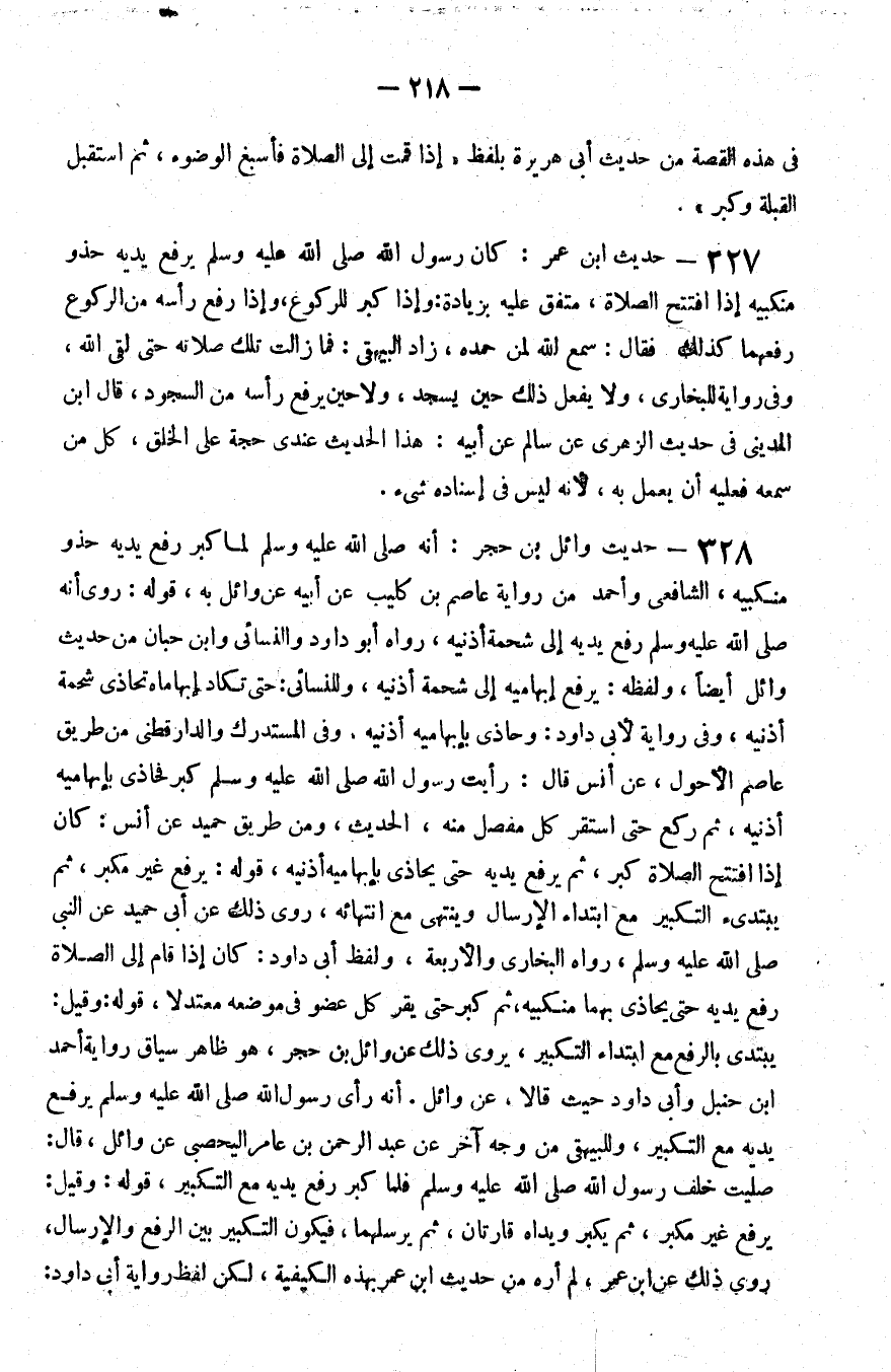 328 - حديث وائل بن حجر أنه صلى الله عليه و سلم لما كبر رفع يديه حذو منكبيه الشافعي وأحمد من رواية عاصم بن كليب عن أبيه عن وائل به قوله روى انه صلى الله عليه و سلم رفع يديه إلى شحمة أذنيه رواه أبو داود والنسائي وابن حبان من حديث وائل أيضا ولفظه يرفع إبهاميه إلى شحمة أذنيه وللنسائي حتى تكاد إبهاماه تحاذي شحمة أذنيه وفي رواية لأبي داود وحاذى بإبهاميه أذنيه وفي المستدرك والدارقطني من طريق عاصم الأحول عن أنس قال رأيت رسول الله صلى الله عليه و سلم كبر فحاذى بإبهاميه أذنيه ثم ركع حتى استقر كل مفصل منه الحديث ومن طريق حميد عن أنس كان إذا افتتح الصلاة كبر ثم يرفع يديه حتى يحاذي بإبهاميه أذنيه قوله يرفع غير مكبر ثم يبتدئ التكبير مع ابتداء الإرسال وينتهي مع انتهائه روي ذلك عن أبي حميد عن النبي صلى الله عليه و سلم رواه البخاري والأربعة ولفظ أبي داود كان إذا قام إلى الصلاة رفع يديه حتى يحاذي بهما منكبيه ثم كبر حتى يقر كل عضو في موضعه معتدلا قوله وقيل يبتدئ بالرفع مع ابتداء التكبير يروى ذلك عن وائل بن حجر هو ظاهر سياق رواية أحمد بن حنبل وأبي داود حيث قالا عن وائل أنه رأى رسول الله صلى الله عليه و سلم يرفع يديه مع التكبير وللبيهقي من وجه آخر عن عبد الرحمن بن عامر اليحصبي عن وائل قال صليت خلف رسول الله صلى الله عليه و سلم فلما كبر رفع يديه مع التكبير قوله وقيل يرفع غير مكبر ثم يكبر ويداه قارتان ثم يرسلهما فيكون التكبير بين الرفع والإرسال روى ذلك عن بن عمر لم أره من حديث بن عمر بهذه الكيفية لكن لفظ رواية أبي داود
