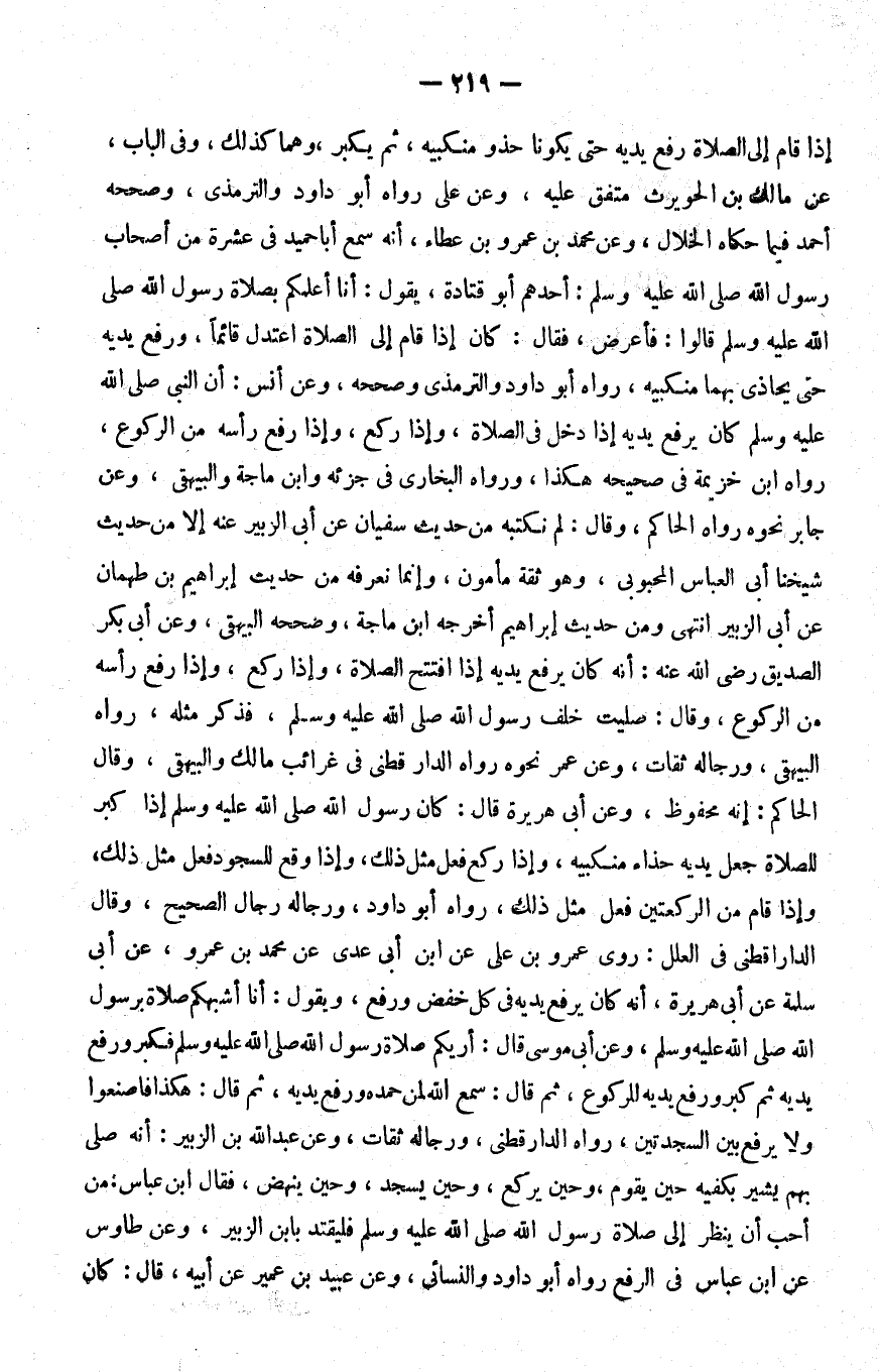 إذا قام إلى الصلاة رفع يديه حتى يكونا حذو منكبيه ثم يكبر وهما كذلك وفي الباب عن مالك بن الحويرث متفق عليه وعن علي رواه أبو داود والترمذي وصححه أحمد فيما حكاه الخلال وعن محمد بن عمرو بن عطاء أنه سمع أبا حميد في عشرة من أصحاب رسول الله صلى الله عليه و سلم أحدهم أبو قتادة يقول أنا أعلمكم بصلاة رسول الله صلى الله عليه و سلم قالوا فأعرض فقال كان إذا قام إلى الصلاة اعتدل قائما ورفع يديه حتى يحاذي بهما منكبيه رواه أبو داود والترمذي وصححه وعن أنس أن النبي صلى الله عليه و سلم كان يرفع يديه إذا دخل في الصلاة وغذا ركع وإذا رفع رأسه من الركوع رواه بن خزيمة في صحيحه هكذا ورواه البخاري في جزئه وابن ماجة والبيهقي وعن جابر نحوه رواه الحاكم وقال لم نكتبه من حديث سفيان عن أبي الزبير عنه إلا من حديث شيخنا أبي العباس المحبوبي وهو ثقة مأمون وإنما نعرفه من حديث إبراهيم بن طهمان عن أبي الزبير انتهى ومن حديث إبراهيم أخرجه بن ماجة وصححه البيهقي وعن أبي بكر الصديق رضي الله عنه أنه كان يرفع يديه إذا افتتح الصلاة وإذا ركع وإذا رفع رأسه من الركوع وقال صليت خلف رسول الله صلى الله عليه و سلم فذكر مثله رواه البيهقي ورجاله ثقات وعن عمر نحوه رواه الدارقطني في غرائب مالك والبيهقي وقال الحاكم إنه محفوظ وعن أبي هريرة قال كان رسول الله صلى الله عليه و سلم إذا كبر للصلاة جعل يديه حذاء منكبيه وإذا ركع فعل مثل ذلك وإذا وقع للسجود فعل مثل ذلك وإذا قام من الركعتين فعل مثل ذلك رواه أبو داود ورجاله رجال الصحيح وقال الدارقطني في العلل روى عمرو بن علي عن بن أبي عدي عن محمد بن عمرو عن أبي سلمة عن أبي هريرة أنه كان يرفع يديه في كل خفض ورفع ويقول أنا أشبهكم صلاة برسول الله صلى الله عليه و سلم وعن أبي موسى قال أريكم صلاة رسول الله صلى الله عليه و سلم فكبر ورفع يديه ثم كبر ورفع يديه للركوع ثم قال سمع الله لمن حمده ورفع يديه ثم قال هكذا فاصنعوا ولا يرفع بين السجدتين رواه الدارقطني ورجاله ثقات وعن عبد الله بن الزبير أنه صلى بهم يشير بكفيه حين يقوم وحين يركع وحين يسجد وحين ينهض فقال بن عباس من أحب أن ينظر إلى صلاة رسول الله صلى الله عليه و سلم فليقتد بابن الزبير وعن طاوس عن بن عباس في الرفع رواه أبو داود والنسائي وعن عبيد بن عمير عن أبيه قال كان
