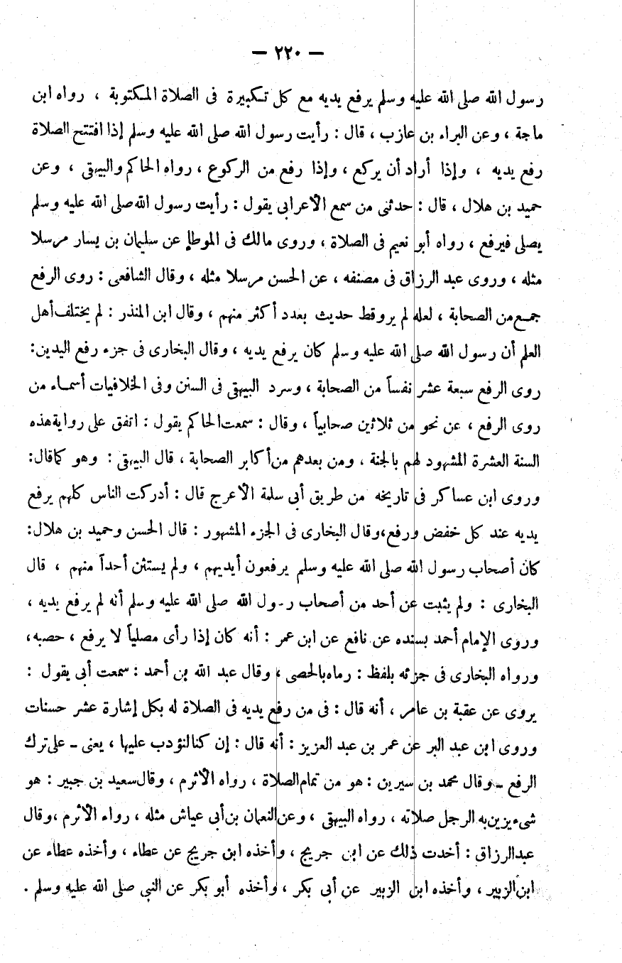رسول الله صلى الله عليه و سلم يرفع يديه مع كل تكبيرة في الصلاة المكتوبة رواه بن ماجة وعن البراء بن عازب قال رأيت رسول الله صلى الله عليه و سلم إذا افتتح الصلاة رفع يديه وإذا أراد أن يركع وإذا رفع من الركوع رواه الحاكم والبيهقي وعن حميد بن هلال قال حدثني من سمع الأعرابي يقول رأيت رسول الله صلى الله عليه و سلم يصلي فيرفع رواه أبو نعيم في الصلاة وروى مالك في الموطأ عن سليمان بن يسار مرسلا مثله وروى عبد الرزاق في مصنفه عن الحسن مرسلا مثله وقال الشافعي روى الرفع جمع من الصحابة لعله لم يرو قط حديث بعدد أكثر منهم وقال بن المنذر لم يختلف أهل العلم أن رسول الله صلى الله عليه و سلم كان يرفع يديه وقال البخاري في جزء رفع اليدين روى الرفع سبعة عشر نفسا من الصحابة وسرد البيهقي في السنن وفي الخلافيات أسماء من روى الرفع عن نحو من ثلاثين صحابيا وقال سمعت الحاكم يقول أتفق على رواية هذه السنة العشرة المشهود لهم بالجنة ومن بعدهم من أكابر الصحابة قال البيهقي وهو كما قال وروى بن عساكر في تاريخه من طريق أبي سلمة الأعرج قال أدركت الناس كلهم يرفع يديه عند كل خفض ورفع وقال البخاري في الجزء المشهور قال الحسن وحميد بن هلال كان أصحاب رسول الله صلى الله عليه و سلم يرفعون أيديهم ولم يستثن أحدا منهم قال البخاري ولم يثبت عن أحد من أصحاب رسول الله صلى الله عليه و سلم أنه لم يرفع يديه وروى الإمام أحمد بسنده عن نافع عن بن عمر انه كان إذا رأى مصليا لا يرفع حصبه ورواه البخاري في جزئه بلفظ رماه بالحصى وقال عبد الله بن أحمد سمعت أبي يقول يروى عن عقبة بن عامر أنه قال في من رفع يديه في الصلاة له بكل إشارة عشر حسنات وروى بن عبد البر عن عمر بن عبد العزيز أنه قال إن كنا لنؤدب عليها يعني على ترك الرفع وقال محمد بن سيرين هو من تمام الصلاة رواه الأثرم وقال سعيد بن جبير هو شيء يزين به الرجل صلاته رواه البيهقي وعن النعمان بن أبي عياش مثله رواه الأثرم وقال عبد الرزاق أخذت ذلك عن بن جريج وأخذه بن جريج عن عطاء وأخذه عطاء عن بن الزبير وأخذه بن الزبير عن أبي بكر وأخذه أبو بكر عن النبي صلى الله عليه و سلم