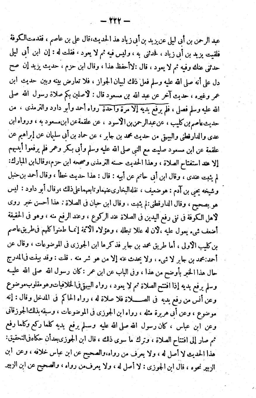 عبد الرحمن بن أبي ليلى عن يزيد بن أبي زياد هذا الحديث قال علي بن عاصم فقدمت الكوفة فلقيت يزيد بن أبي زياد فحدثني به وليس فيه ثم لا يعود فقلت له إن بن أبي ليلى حدثني عنك وفيه ثم لا يعود قال لا أحفظ هذا وقال بن حزم حديث يزيد إن صح دل على أنه صلى الله عليه و سلم فعل ذلك لبيان الجواز فلا تعارض بينه وبين حديث بن عمر وغيره حديث آخر عن عبد الله بن مسعود قال لأصلين بكم صلاة رسول الله صلى الله عليه و سلم فصلى فلم يرفع يديه إلا مرة واحدة رواه أحمد وأبو داود والترمذي من حديث عاصم بن كليب عن عبد الرحمن بن الأسود عن علقمة عن بن مسعود به ورواه بن عدي والدارقطني والبيهقي من حديث محمد بن جابر عن حماد بن أبي سليمان عن إبراهيم عن علقمة عن بن مسعود صليت مع النبي صلى الله عليه و سلم وأبي بكر وعمر فلم يرفعوا أيديهم إلا عند استفتاح الصلاة وهذا الحديث حسنه الترمذي وصححه بن حزم وقال بن المبارك لم يثبت عندي وقال بن أبي حاتم عن أبيه قال هذا حديث خطأ وقال أحمد بن حنبل وشيخه يحيى بن آدم هو ضعيف نقله البخاري عنهما وتابعهما على ذلك وقال أبو داود ليس هو بصحيح وقال الدارقطني لم يثبت وقال بن حبان في الصلاة هذا أحسن خبر روي لأهل الكوفة في نفي رفع اليدين في الصلاة عند الركوع وعند الرفع منه وهو في الحقيقة أضعف شيء يعول عليه لأن له عللا تبطله وهؤلاء الأئمة إنما طعنوا كلهم في طريق عاصم بن كليب الأولى أما طريق محمد بن جابر فذكرها بن الجوزي في الموضوعات وقال عن أحمد محمد بن جابر لا شيء ولا يحدث عنه إلا من هو شر منه قلت وقد بينت في المدرج حال هذا الخبر بأوضح من هذا وفي الباب عن بن عمر كان رسول الله صلى الله عليه و سلم يرفع يديه إذا افتتح الصلاة ثم لا يعود رواه البيهقي في الخلافيات وهو مقلوب موضوع وعن أنس من رفع يديه في الصلاة فلا صلاة له رواه الحاكم في المدخل وقال إنه موضوع وعن أبي هريرة مثله رواه بن الجوزي في الموضوعات وسبقه بذلك الجوزقاني وعن بن عباس كان رسول الله صلى الله عليه و سلم يرفع يديه كلما ركع وكلما رفع ثم صار إلى افتتاح الصلاة وترك ما سوى ذلك قال بن الجوزي بعد أن حكاه في التحقيق هذا الحديث لا أصل له ولا يعرف من رواه والصحيح عن بن عباس خلافه وعن بن الزبير نحوه قال بن الجوزي لا أصل له ولا يعرف من رواه والصحيح عن بن الزبير
