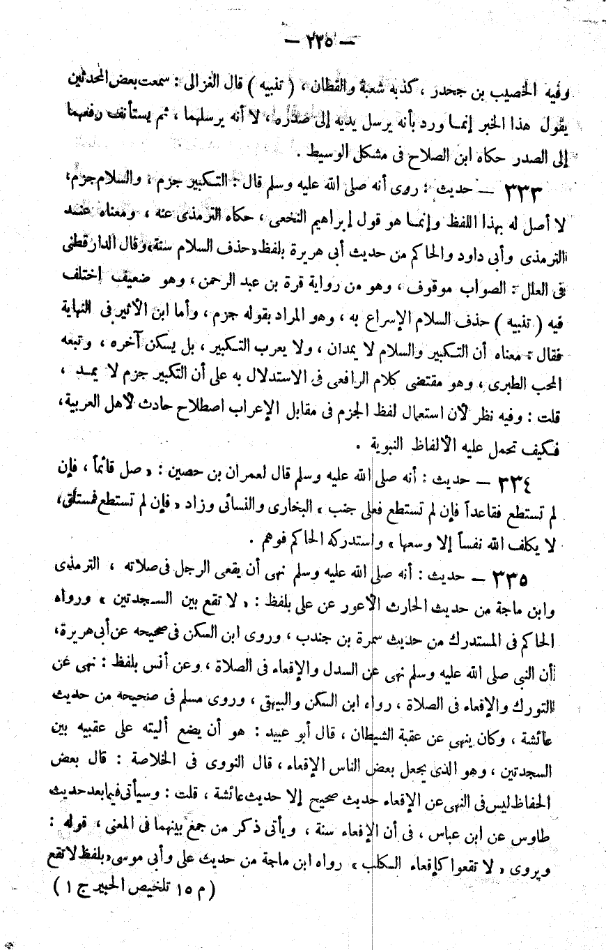 333 - حديث روي أنه صلى الله عليه و سلم قال التكبير جزم والسلام جزم لا أصل له بهذا اللفظ وإنما هو قول إبراهيم النخعي حكاه الترمذي عنه ومعناه عند الترمذي وأبي داود والحاكم من حديث أبي هريرة بلفظ حذف السلام سنة وقال الدارقطني في العلل الصواب موقوف وهو من رواية قرة بن عبد الرحمن وهو ضعيف اختلف فيه