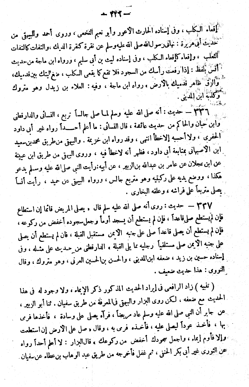 337 - حديث روي أنه صلى الله عليه و سلم قال يصلي المريض قائما إن استطاع فإن لم يستطع صلى قاعدا فإن لم يستطع أن يسجد أومأ وجعل سجوده أخفض من ركوعه فإن لم يستطع أن يصلي قاعدا صلى على جنبه الأيمن مستقبل القبلة فإن لم يستطع أن يصلي على جنبه الأيمن صلى مستلقيا رجليه مما يلي القبلة الدارقطني من حديث على مثله وفي إسناده حسين بن زيد ضعفه بن المديني والحسن بن الحسين العرني وهو متروك وقال النووي هذا حديث ضعيف
