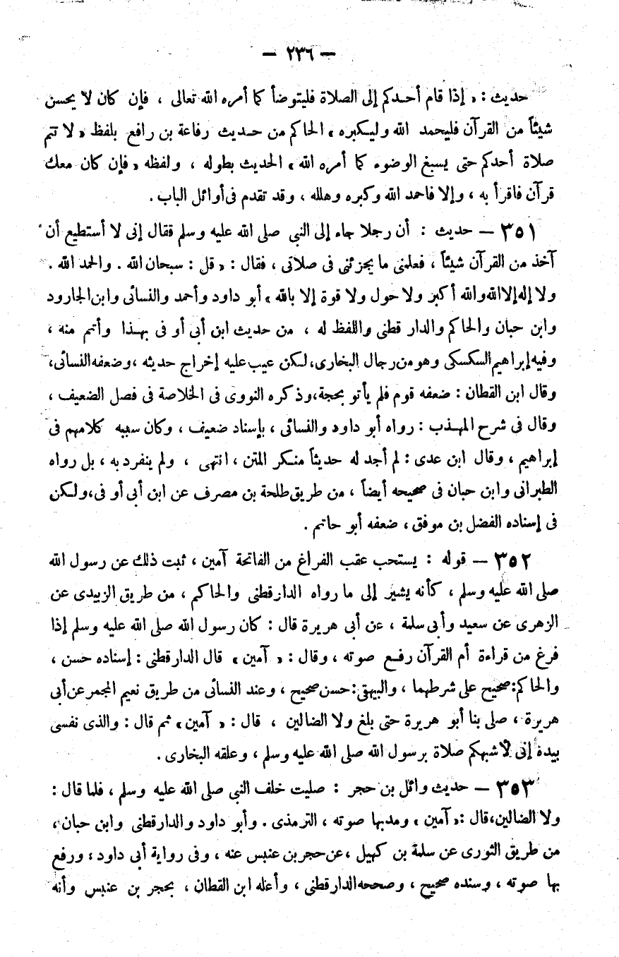 353 - حديث وائل بن حجر صليت خلف النبي صلى الله عليه و سلم فلما قال ولا الضالين قال آمين ومد بها صوته الترمذي وأبو داود والدارقطني وابن حبان من طريق الثوري عن سلمة بن كهيل عن حجر بن عنبس عنه وفي رواية أبي داود ورفع بها صوته وسنده صحيح وصححه الدارقطني وأعله بن القطان بحجر بن عنبس وأنه