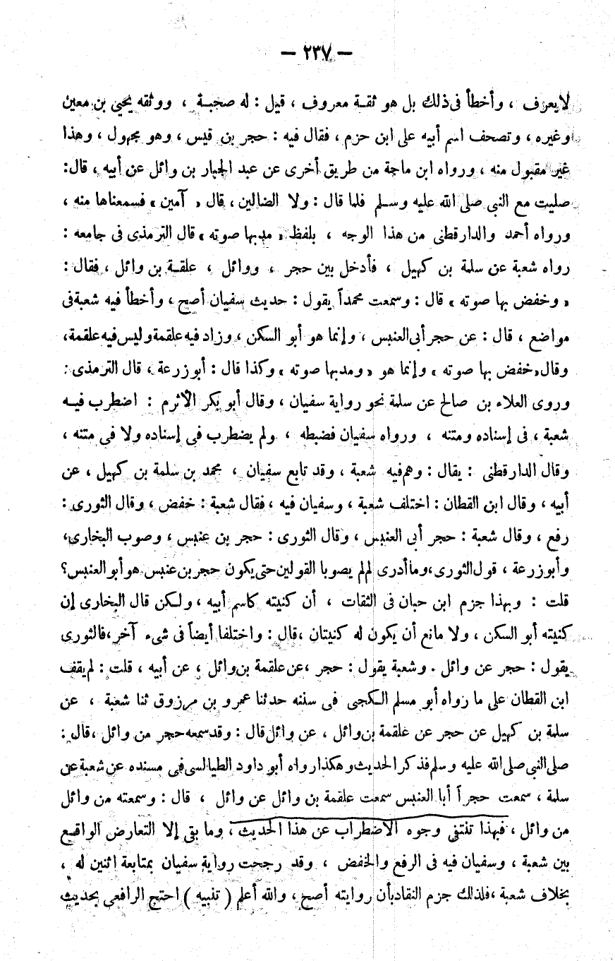 لا يعرف وأخطأ في ذلك بل هو ثقة معروف قيل له صحبة ووثقه يحيى بن معين وغيره وتصحف اسم أبيه على بن حزم فقال فيه حجر بن قيس وهو مجهول وهذا غير مقبول منه ورواه بن ماجة من طريق أخرى عن عبد الجبار بن وائل عن أبيه قال صليت مع النبي صلى الله عليه و سلم فلما قال ولا الضالين قال آمين فسمعناها منه ورواه أحمد والدارقطني من هذا الوجه بلفظ مد بها صوته قال الترمذي في جامعه رواه شعبة عن سلمة بن كهيل فأدخل بين حجر ووائل علقة بن وائل فقال وخفض بها صوته قال وسمعت محمدا يقول حديث سفيان أصح وأخطأ فيه شعبة في مواضع قال عن حجر أبي العنبس وإنما هو أبو السكن وزاد فيه علقمة وليس فيه علقمة وقال خفض بها صوته وإنما هو ومد بها صوته وكذا قال أبو زرعة قال الترمذي وروى العلاء بن صالح عن سلمة نحو رواية سفيان وقال أبو بكر الأثرم اضطرب فيه شعبة في إسناده ومتنه ورواه سفيان فضبطه ولم يضطرب في إسناده ولا في متنه وقال الدارقطني يقال وهم فيه شعبة وقد تابع سفيان محمد بن سلمة بن كهيل عن أبيه وقال بن القطان اختلف شعبة وسفيان فيه فقال شعبة خفض وقال الثوري رفع وقال شعبة حجر أبي العنبس وقال الثوري حجر بن عنبس وصوب البخاري وأبو زرعة قول الثوري وما أدري لم لم يصوبا القولين حتى يكون حجر بن عنبس هو أبو العنبس قلت وبهذا جزم بن حبان في الثقات أن كنيته كاسم أبيه ولكن قال البخاري إن كنيته أبو السكن ولا مانع أن يكون له كنيتان قال واختلفا أيضا في شيء آخر فالثوري يقول حجر عن وائل وشعبة يقول حجر عن علقمة بن وائل عن أبيه قلت لم يقف بن القطان على ما رواه أبو مسلم الكجي في سننه حدثنا عمرو بن مرزوق ثنا شعبة عن سلمة بن كهيل عن حجر عن علقمة بن وائل عن وائل قال وقد سمعه حجر من وائل قال صلى النبي صلى الله عليه و سلم فذكر الحديث وهكذا رواه أبو داود الطيالسي في مسنده عن شعبة عن سلمة سمعت حجرا أبا العنبس سمعت علقمة بن وائل عن وائل قال وسمعته من وائل من وائل فبهذا تنتفي وجوه الاضطراب عن هذا الحديث وما بقي إلا التعارض الواقع بين شعبة وسفيان فيه في الرفع والخفض وقد رجحت رواية سفيان بمتابعة اثنين له بخلاف شعبة فلذلك جزم النقاد بأن روايته أصح والله أعلم