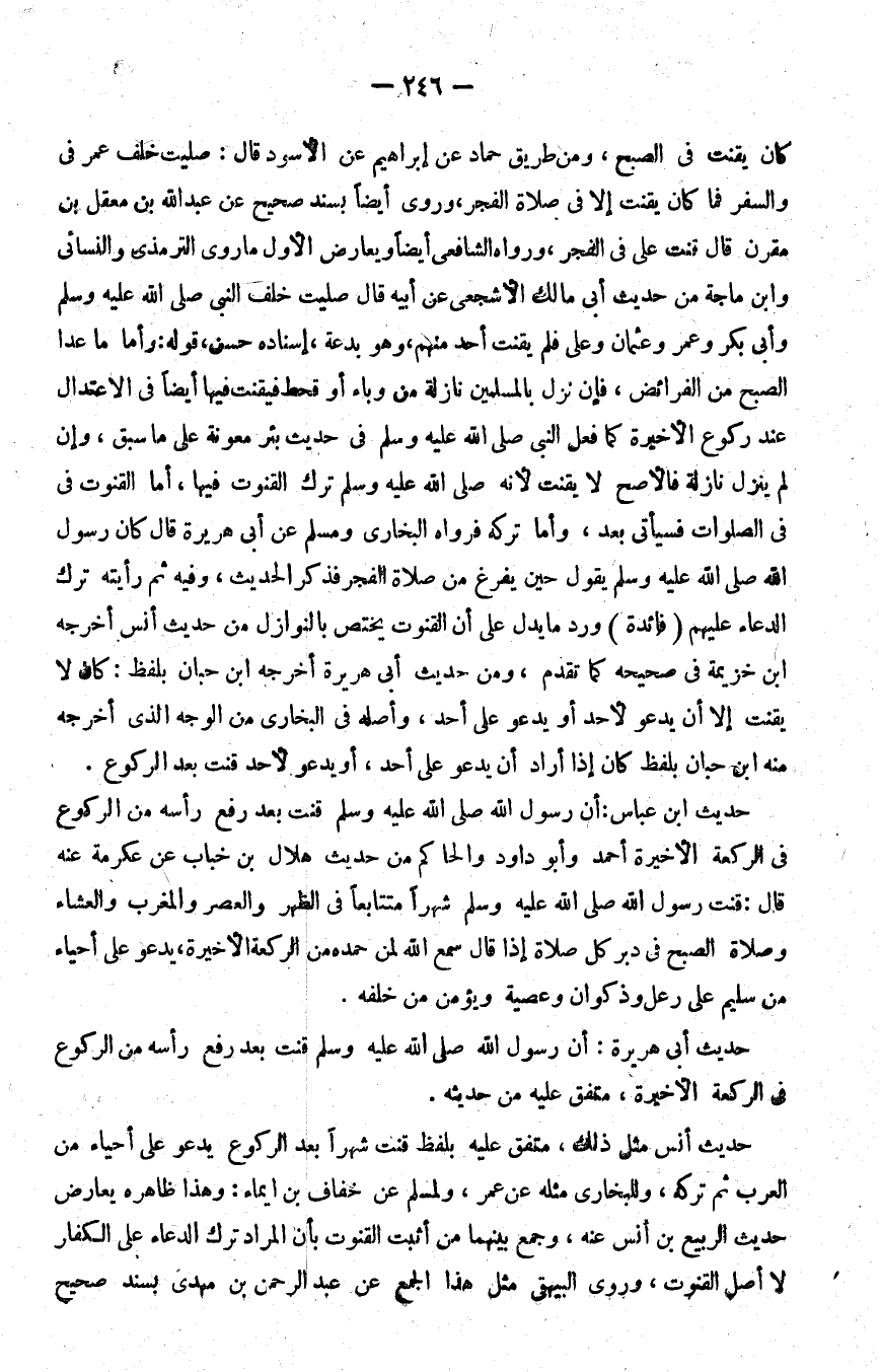 كان يقنت في الصبح ومن طريق حماد عن إبراهيم عن الأسود قال صليت خلف عمر في والسفر فما كان يقنت إلا في صلاة الفجر وروى أيضا بسند صحيح عن عبد الله بن معقل بن مقرن قال قنت علي في الفجر ورواه الشافعي أيضا ويعارض الأول ما روى الترمذي والنسائي وابن ماجة من حديث أبي مالك الأشجعي عن أبيه قال صليت خلف رسول الله صلى الله عليه و سلم وأبي بكر وعمر وعثمان وعلي فلم يقنت أحد منهم وهو بدعة إسناده حسن قوله وأما ما عدا الصبح من الفرائض فإن نزل بالمسلمين نازلة من وباء أو قحط فيقنت فيها أيضا في الاعتدال عند ركوع الأخيرة كما فعل النبي صلى الله عليه و سلم في حديث بئر معونة على ما سبق وإن لم ينزل نازلة فالأصح لا يقنت لأنه صلى الله عليه و سلم ترك القنوت فيها أما القنوت في الصلوات فسيأتي بعد وأما تركه فرواه البخاري ومسلم عن أبي هريرة قال كان رسول الله صلى الله عليه و سلم يقول حين يفرغ من صلاة الفجر فذكر الحديث وفيه ثم رأيته ترك الدعاء عليهم