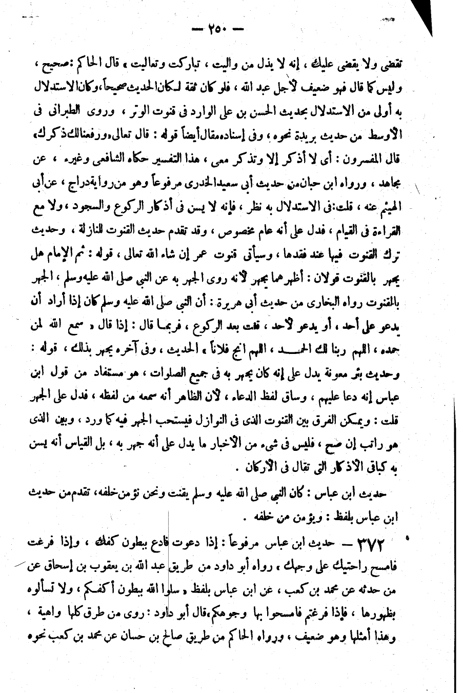 إنك تقضي ولا يقضى عليك إنه لا يذل من واليت تباركت وتعاليت قال الحاكم صحيح وليس كما قال فهو ضعيف لأجل عبد الله فلو كان ثقة لكان الحديث صحيحا وكان الاستدلال به أولى من الاستدلال بحديث الحسن بن علي الوارد في قنوت الوتر وروى الطبراني في الأوسط من حديث بريدة نحوه وفي إسناده مقال أيضا قوله قال تعالى ورفعنا لك ذكرك قال المفسرون أي لا أذكر إلا وتذكر معي هذا التفسير حكاه الشافعي وغيره عن مجاهد ورواه بن حبان من حديث أبي سعيد الخدري مرفوعا وهو من رواية دراج عن أبي الهيثم عنه قلت في الاستدلال به نظر فإنه لا يسن في أذكار الركوع والسجود ولا مع القراءة في القيام فدل على انه عام مخصوص وقد تقدم حديث القنوت للنازلة وحديث ترك القنوت فيها عند فقدها وسيأتي قنوت عمر إن شاء الله تعالى قوله ثم الإمام هل يجهر بالقنوت قولان أظهرهما يجهر لأنه روى الجهر به عن النبي صلى الله عليه و سلم الجهر بالقنوت رواه البخاري من حديث أبي هريرة أن النبي صلى الله عليه و سلم كان إذا أراد أن يدعو على أحد أو يدعو لأحد قنت بعد الركوع فربما قال إذا قال سمع الله لمن حمده اللهم ربنا لك الحمد اللهم انج فلانا الحديث وفي آخره يجهر بذلك قوله وحديث بئر معونة يدل على أنه كان يجهر به في جميع الصلوات هو مستفاد من قول بن عباس إنه دعا عليهم وساق لفظ الدعاء لأن الظاهر أنه سمعه من لفظه فدل على الجهر قلت ويمكن الفرق بين القنوت الذي في النوازل فيستحب الجهر فيه كما ورد وبين الذي هو راتب إن صح فليس في شيء من الأخبار ما يدل على أنه جهر به بل القياس أنه يسن به كباقي الأذكار التي تقال في الأركان