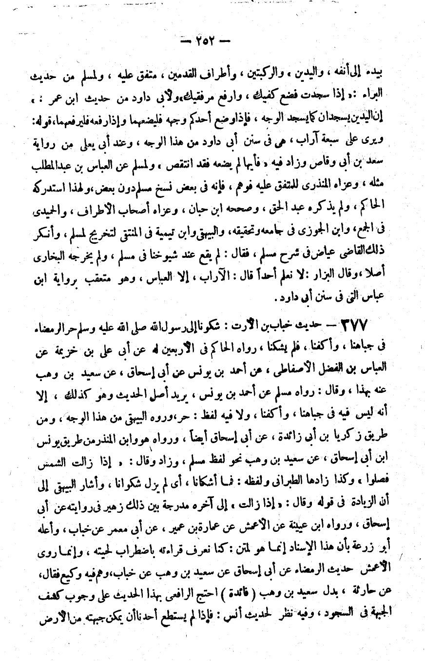 377 - حديث خباب بن الأرت شكونا إلى رسول الله صلى الله عليه و سلم حر الرمضاء في جباهنا وأكفنا فلم يشكنا رواه الحاكم في الأربعين له عن أبي علي بن خزيمة عن العباس بن الفضل الأصفاطي عن أحمد بن يونس عن أبي إسحاق عن سعيد بن وهب عنه بهذا وقال رواه مسلم عن أحمد بن يونس يريد أصل الحديث وهو كذلك إلا أنه ليس فيه في جباهنا وأكفنا ولا فيه لفظ حر ورواه البيهقي من هذا الوجه ومن طريق زكريا بن أبي زائدة عن أبي إسحاق أيضا ورواه هو وابن المنذر من طريق يونس بن أبي إسحاق عن سعيد بن وهب نحو لفظ مسلم وزاد وقال إذا زالت الشمس فصلوا وكذا زادها الطبراني ولفظه فما أشكانا أي لم يزل شكوانا وأشار البيهقي إلى أن الزيادة في قوله وقال إذا زالت إلى آخره مدرجة بين ذلك زهير في روايته عن أبي إسحاق ورواه بن عيينة عن الأعمش عن عمارة بن عمير عن أبي معمر عن خباب وأعله أبو زرعة بأن هذا الإسناد إنما هو لمتن كنا نعرف قراءته باضطراب لحيته وإنما روى العمش حديث الرمضاء عن أبي إسحاق عن سعيد بن وهب عن خباب وهم فيه وكيع فقال عن حارثة بدل سعيد بن وهب