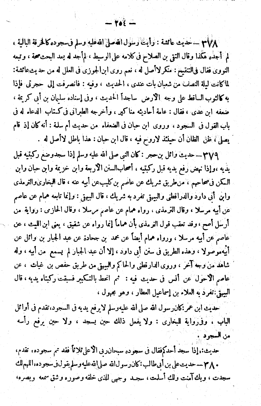 379 - حديث وائل بن حجر كان النبي صلى الله عليه و سلم إذا سجد وضع ركبتيه قبل يديه وإذا نهض رفع يديه قبل ركبتيه أصحاب السنن الأربعة وابن خزيمة وابن حبان وابن السكن في صحاحهم من طريق شريك عن عاصم بن كليب عن أبيه عنه قال البخاري والترمذي وابن أبي داود والدارقطني والبيهقي تفرد به شريك قال البيهقي وإنما تابعه همام عن عاصم عن أبيه مرسلا وقال الترمذي رواه همام عن عاصم مرسلا وقال الحازمي رواية من أرسل أصح وقد تعقب قول الترمذي بأن هماما إنما رواه عن شقيق يعني بن الليث عن عاصم عن أبيه مرسلا ورواه همام أيضا عن محمد بن جحادة عن عبد الجبار بن وائل عن أبيه موصولا وهذه الطريق في سنن أبي داود إلا أن عبد الجبار لم يسمع من أبيه وله شاهد من وجه آخر وروى الدارقطني والحاكم والبيهقي من طريق حفص بن غياث عن عاصم الأحول عن أنس في حديث فيه ثم انحط بالتكبير فسبقت ركبتاه يديه قال البيهقي تفرد به العلاء بن إسماعيل العطار وهو مجهول