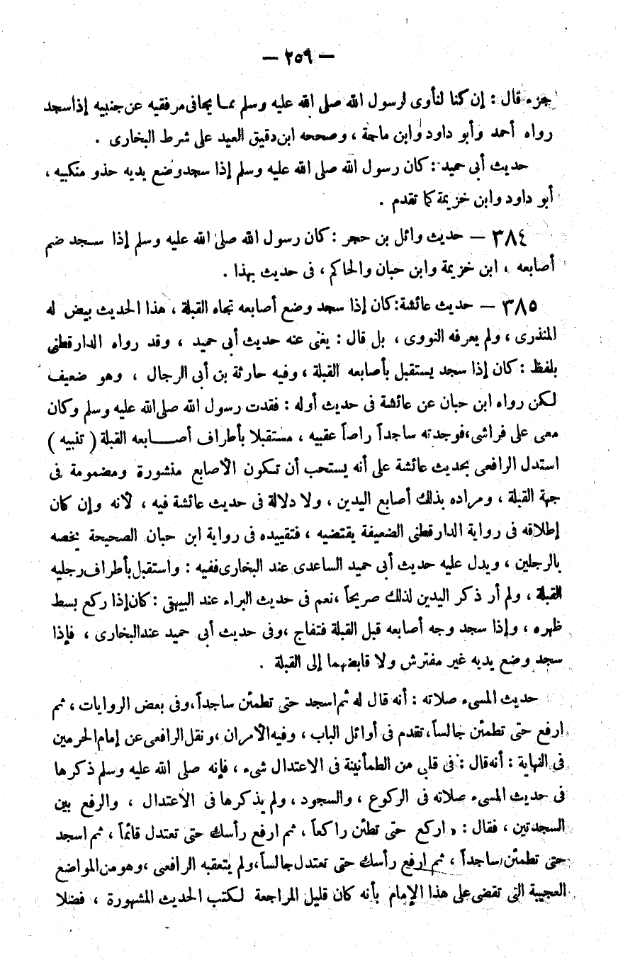 385 - حديث عائشة كان إذا سجد وضع أصابعه تجاه القبلة هذا الحديث بيض له المنذري ولم يعرفه النووي بل قال يغني عنه حديث أبي حميد وقد رواه الدارقطني بلفظ كان إذا سجد يستقبل بأصابعه القبلة وفيه حارثة بن أبي الرجال وهو ضعيف لكن رواه بن حبان عن عائشة في حديث أوله فقدت رسول الله صلى الله عليه و سلم وكان معي على فراشي فوجدته ساجدا راصا عقبيه مستقبلا بأطراف أصابعه القبلة