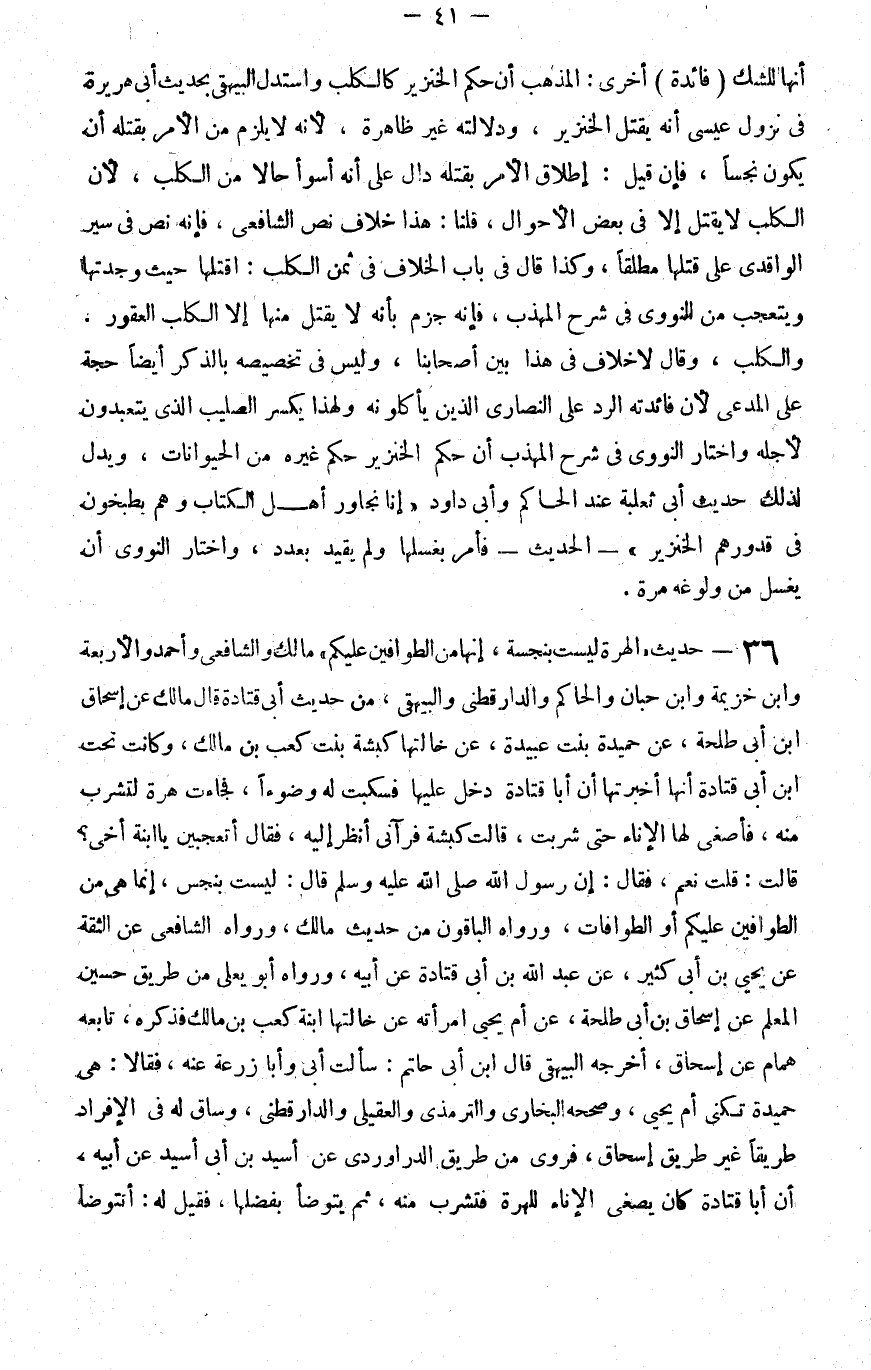 36 - حديث الهرة ليست بنجسة إنها من الطوافين عليكم مالك والشافعي وأحمد والأربعة وابن خزيمة وابن حبان والحاكم والدارقطني والبيهقي من حديث أبي قتادة قال مالك عن إسحاق بن أبي طلحة عن حميدة بنت عبيدة عن خالتها كبشة بنت كعب بن مالك وكانت تحت بن أبي قتادة أنها أخبرتها أن أبا قتادة دخل عليها فسكبت له وضوءا فجاءت هرة لتشرب منه فأصغى لها الإناء حتى شربت قالت كبشة فرآني أنظر إليه فقال أتعجبين يا ابنة أخي قالت قلت نعم فقال إن رسول الله صلى الله عليه و سلم قال ليست بنجس إنما هي من الطوافين عليكم أو الطوافات ورواه الباقون من حديث مالك ورواه الشافعي عن الثقة عن يحيى بن أبي كثير عن عبد الله بن أبي قتادة عن أبيه ورواه أبو يعلى من طريق حسين المعلم عن إسحاق بن أبي طلحة عن أم يحيى امرأته عن خالتها ابنة كعب بن مالك فذكره تابعه همام عن إسحاق أخرجه البيهقي قال بن أبي حاتم سألت أبي وأبا زرعة عنه فقالا هي حميدة تكنى أم يحيى وصححه البخاري والترمذي والعقيلي والدارقطني وساق له في الإفراد طريقا غير طريق إسحاق فروى من طريق الدراوردي عن أسيد بن أبي أسيد عن أبيه أن أبا قتادة كان يصغى الإناء للهرة فتشرب منه ثم يتوضأ بفضلها فقيل له أنتوضأ