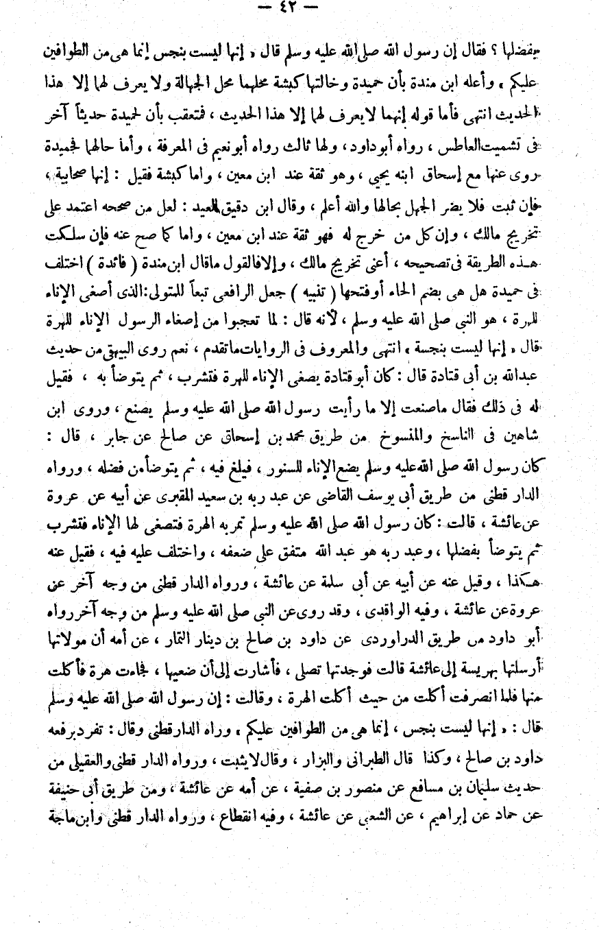تنبيه جعل الرافعي تبعا للمتولي الذي أصغى الإناء للمرة هو النبي صلى الله عليه و سلم لأنه قال لما تعجبوا من إصغاء الرسول الإناء للهرة قال إنها ليست بنجسة انتهى والمعروف في الروايات ما تقدم نعم روى البيهقي من حديث عبد الله بن أبي قتادة قال كان أبو قتادة يصغى الإناء للهرة فتشرب ثم يتوضأ به فقيل له في ذلك فقال ما صنعت إلا ما رأيت رسول الله صلى الله عليه و سلم يصنع وروى بن شاهين في الناسخ والمنسوخ من طريق محمد بن إسحاق عن صالح عن جابر قال كان رسول الله صلى الله عليه و سلم يضع الإناء للسنور فيلغ فيه ثم يتوضأ من فضله ورواه الدارقطني من طريق أبي يوسف القاضي عن عبد ربه بن سعيد المقبري عن أبيه عن عروة عن عائشة قالت كان رسول الله صلى الله عليه و سلم تمر به الهرة فتصغى لها الإناء فتشرب ثم يتوضأ بفضلها وعبد ربه هو عبد الله متفق على ضعفه واختلف عليه فيه فقيل عنه هكذا وقيل عنه عن أبيه عن أبي سلمة عن عائشة ورواه الدارقطني من وجه آخر عن عروة عن عائشة وفيه الواقدي وقد روي عن النبي صلى الله عليه و سلم من وجه آخر رواه أبو داود من طريق الدراوردي عن داود بن صالح بن دينار التمار عن أمه أن مولاتها أرسلتها بهريسة إلى عائشة قالت فوجدتها تصلي فأشارت إلى أن ضعيها فجاءت هرة فأكلت منها فلما انصرفت أكلت من حيث أكلت الهرة وقالت إن رسول الله صلى الله عليه و سلم قال إنها ليست بنجس إنما هي من الطوافين عليكم ورآه الدارقطني وقال تفرد برفعه داود بن صالح وكذا قال الطبراني والبزار وقال لا يثبت ورواه الدارقطني والعقيلي من حديث سليمان بن مسافع عن منصور بن صفية عن أمه عن عائشة ومن طريق أبي حنيفة عن حماد عن إبراهيم عن الشعبي عن عائشة وفيه انقطاع ورواه الدارقطني وابن ماجة