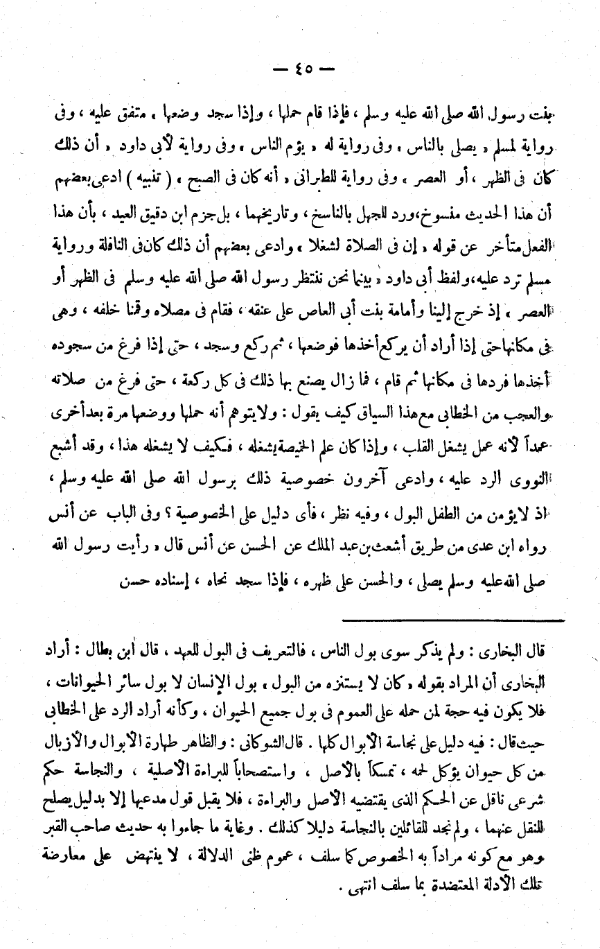 تنبيه ادعى بعضهم أن هذا الحديث منسوخ ورد للجهل بالناسخ وتاريخهما بل جزم بن دقيق العيد بأن هذا الفعل متأخر عن قوله إن في الصلاة لشغلا وادعى بعضهم أن ذلك كان في النافلة ورواية مسلم ترد عليه ولفظ أبي داود بينما نحن ننتظر رسول الله صلى الله عليه و سلم في الظهر أو العصر إذ خرج إلينا وأمامة بنت أبي العاص على عنقه فقام في مصلاه وقمنا خلفه وهي في مكانها حتى إذا أراد أن يركع أخذها فوضعها ثم ركع وسجد حتى إذا فرغ من سجوده أخذها فردها في مكانها ثم قام فما زال يصنع بها ذلك في كل ركعة حتى فرغ من صلاته والعجب من الخطابي مع هذا السياق كيف يقول ولا يتوهم أنه حملها ووضعها مرة بعد أخرى عمدا لأنه عمل يشغل القلب وإذا كان علم الخميصة يشغله فكيف لا يشغله هذا وقد أشبع النووي الرد عليه وادعى آخرون خصوصية ذلك برسول الله صلى الله عليه و سلم إذ لا يؤمن من الطفل البول وفيه نظر فأي دليل على الخصوصية وفي الباب عن أنس رواه بن عدي من طريق أشعث بن عبد الملك عن الحسن عن أنس قال رأيت رسول الله صلى الله عليه و سلم يصلي والحسن على ظهره فإذا سجد نحاه إسناده حسن