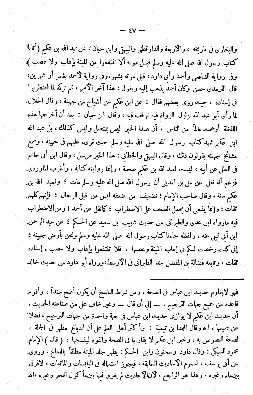 والبخاري في تاريخه والأربعة والدارقطني والبيهقي وابن حبان عن عبد الله بن عكيم أتانا كتاب رسول الله صلى الله عليه و سلم قبل موته ألا تنتفعوا من الميتة بإهاب ولا عصب وفي رواية الشافعي وأحمد وأبي داود قبل موته بشهر وفي رواية لأحمد بشهر أو شهرين قال الترمذي حسن وكان أحمد يذهب إليه ويقول هذا آخر الأمر ثم تركه لما اضطربوا في إسناده حيث روى بعضهم فقال عن بن عكيم عن أشياخ من جهينة وقال الخلال لما رأى أبو عبد الله تزلزل الرواة فيه توقف فيه وقال بن حبان بعد أن أخرجها هذه اللفظة أوهمت عالما من الناس أن هذا الخبر ليس بمتصل وليس كذلك بل عبد الله بن عكيم شهد كتاب رسول الله صلى الله عليه و سلم حيث قرئ عليهم في جهينة وسمع مشائخ جهينة يقولون ذلك وقال البيهقي والخطابي هذا الخبر مرسل وقال بن أبي حاتم في العلل عن أبيه ليست لعبد الله بن عكيم صحبة وإنما روايته كتابة وأغرب الماوردي فزعم أنه نقل عن علي بن المديني أن رسول الله صلى الله عليه و سلم مات ولعبد الله بن عكيم سنة وقال صاحب الإمام تضعيف من ضعفه ليس من قبل الرجال فإنهم كلهم ثقات وإنما ينبغي أن يحمل الضعف على الاضطراب كما نقل عن أحمد ومن الاضطراب فيه ما رواه بن عدي والطبراني من حديث شبيب بن سعيد عن الحكم عن عبد الرحمن بن أبي ليلى عنه ولفظه جاءنا كتاب رسول الله صلى الله عليه و سلم ونحن بأرض جهينة إني كنت رخصت لكم في إهاب الميتة وعصبها فلا تنتفعوا بإهاب ولا عصب إسناده ثقات وتابعه فضالة بن المفضل عند الطبراني في الأوسط ورواه أبو داود من حديث خالد