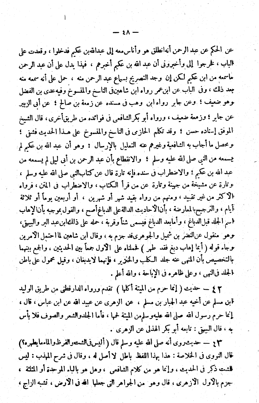 42 - حديث إنما حرم من الميتة أكلها تقدم ورواه الدارقطني من طريق الوليد بن مسلم عن أخيه عبد الجبار بن مسسلم عن الزهري عن عبيد الله عن بن عباس قال إنما حرم رسول الله صلى الله عليه و سلم من الميتة لحمها فأما الجلد والشعر والصوف فلا بأس به قال البيهقي تابعه أبو بكر الهذلي عن الزهري