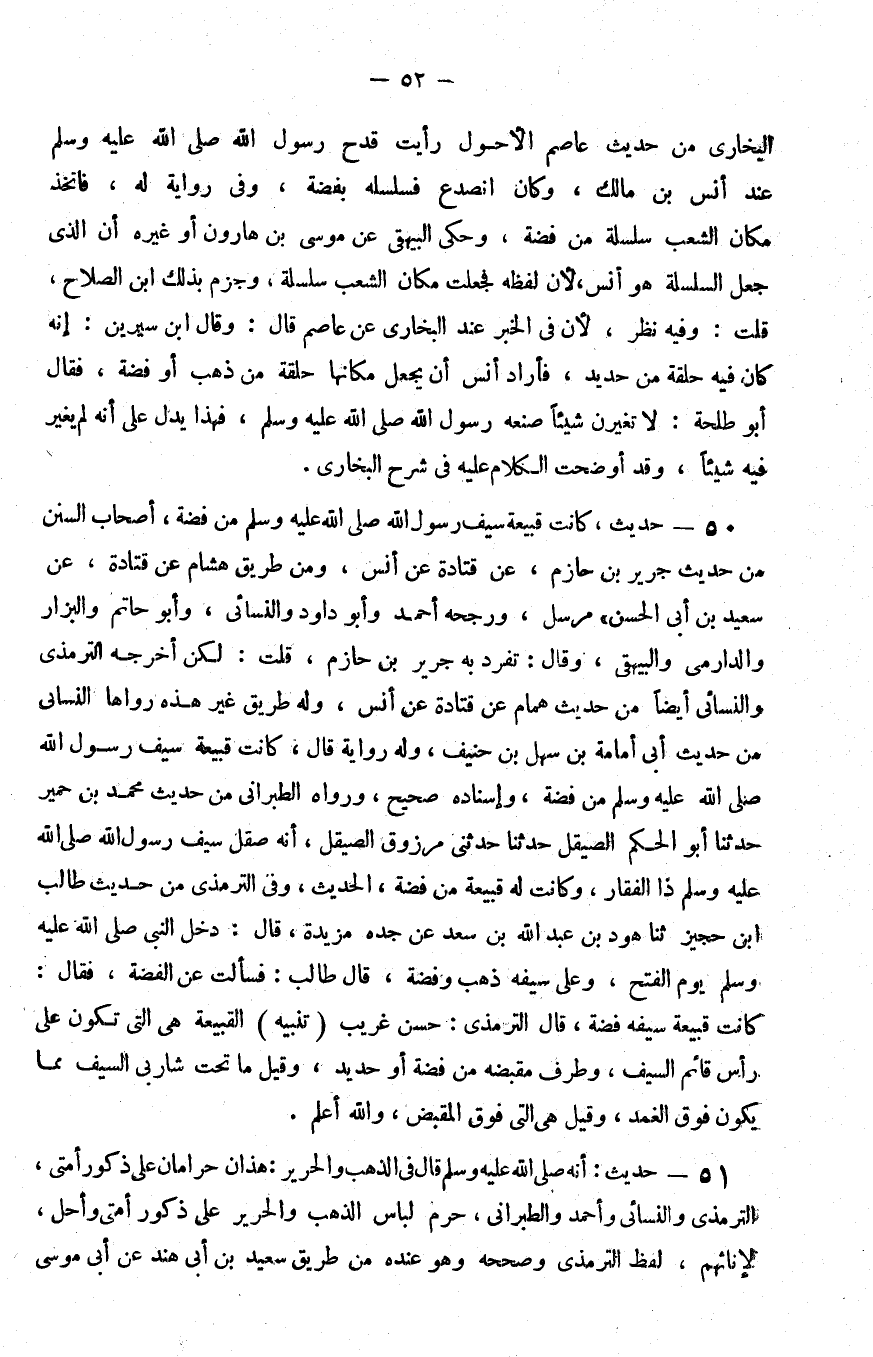 50 - حديث كانت قبيعة سيف رسول الله صلى الله عليه و سلم من فضة أصحاب السنن من حديث جرير بن حازم عن قتادة عن أنس ومن طريق هشام عن قتادة عن سعيد بن أبي الحسن مرسل ورجحه أحمد وأبو داود والنسائي وأبو حاتم والبزار والدارمي والبيهقي وقال تفرد به جرير بن حازم قلت لكن أخرجه الترمذي والنسائي أيضا من حديث همام عن قتادة عن أنس وله طريق غير هذه رواها النسائي من حديث أبي أمامة بن سهل بن حنيف وله رواية قال كانت قبيعة سيف رسول الله صلى الله عليه و سلم من فضة وإسناده صحيح ورواه الطبراني من حديث محمد بن حمير حدثنا أبو الحكم الصيقل حدثنا حدثني مرزوق الصيقل أنه صقل سيف رسول الله صلى الله عليه و سلم ذا الفقار وكانت له قبيعة من فضة الحديث