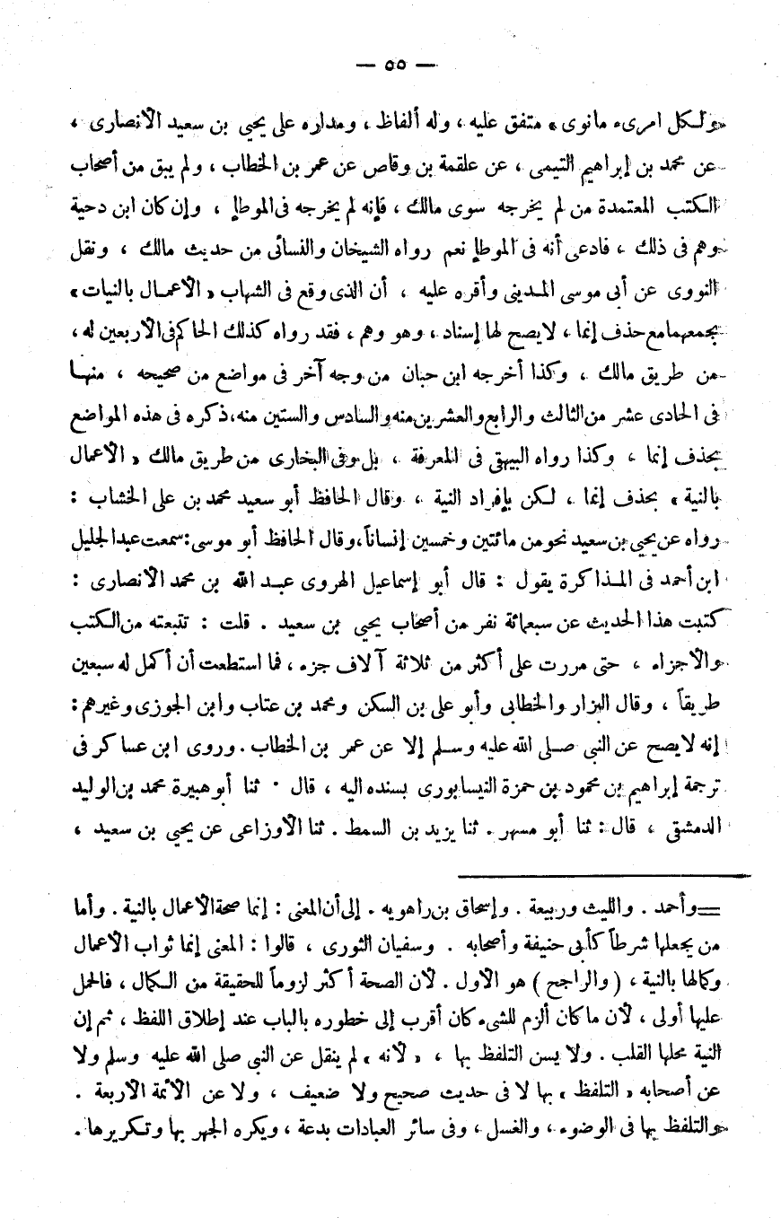 لكل امرئ ما نوى وفي رواية ولكل امرئ ما نوى متفق عليه وله ألفاظ ومداره على يحيى بن سعيد الأنصاري عن محمد بن إبراهيم التيمي عن علقمة بن وقاص عن عمر بن الخطاب ولم يبق من أصحاب الكتب المعتمدة من لم يخرجه سوى مالك فإنه لم يخرجه في الموطأ وإن كان بن دحية وهم في ذلك فادعى أنه في الموطأ نعم رواه الشيخان والنسائي من حديث مالك ونقل النووي عن أبي موسى المديني وأقره عليه أن الذي وقع في الشهاب الأعمال بالنيات بجمعهما مع حذف إنما لا يصح لها إسناد وهو وهم فقد رواه كذلك الحاكم في الأربعين له من طريق مالك وكذا أخرجه بن حبان من وجه آخر في مواضع من صحيحه منها في الحادي عشر من الثالث والرابع والعشرين منه والسادس والستين منه ذكره في هذه المواضع بحذف إنما وكذا رواه البيهقي في المعرفة بل وفي البخاري من طريق مالك الأعمال بالنية بحذف إنما لكن بإفراد النية وقال الحافظ أبو سعيد محمد بن علي الخشاب رواه عن يحيى بن سعيد نحو من مائتين وخمسين إنسانا وقال الحافظ أبو موسى سمعت عبد الجليل بن أحمد في المذاكرة يقول قال أبو إسماعيل الهروي عبد الله بن محمد الأنصاري كتبت هذا الحديث عن سبعمائة نفر من أصحاب يحيى بن سعيد قلت تتبعته من الكتب والأجزاء حتى مررت على أكثر من ثلاثة آلاف جزء فما استطعت أن أكمل له سبعين طريقا وقال البزار والخطابي وأبو علي بن السكن ومحمد بن عتاب وابن الجوزي وغيرهم إنه لا يصح عن النبي صلى الله عليه و سلم إلا عن عمر بن الخطاب وروى بن عساكر في ترجمة إبراهيم بن محمود بن حمزة النيسابوري بسنده إليه قال ثنا أبو هبيرة محمد بن الوليد الدمشقي قال ثنا أبو مسهر ثنا يزيد بن السمط ثنا الأوزاعي عن يحيى بن سعيد