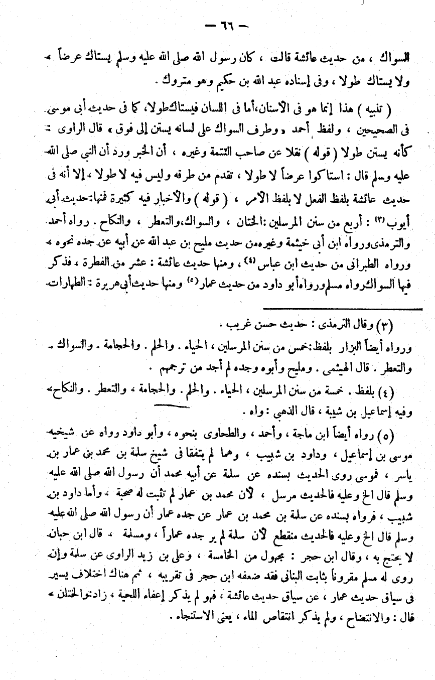 تنبيه هذا إنما هو في الأسنان أما في اللسان فيستاك طولا كما في حديث أبي موسى في الصحيحين ولفظ أحمد وطرف السواك على لسانه يستن إلى فوق قال الراوي كأنه يستن طولا قوله نقلا عن صاحب التتمة وغيره أن الخبر ورد أن النبي صلى الله عليه و سلم قال استاكوا عرضا لا طولا تقدم من طرقه وليس فيه لا طولا إلا أنه في حديث عائشة بلفظ الفعل لا بلفظ الأمر قوله والأخبار فيه كثيرة فمنها حديث أبي أيوب 3 أربع من سنن المرسلين الختان والسواك والتعطر والنكاح رواه أحمد والترمذي ورواه بن أبي خيثمة وغيره من حديث مليح بن عبد الله عن أبيه عن جده نحوه ورواه الطبراني من حديث بن عباس 4 ومنها حديث عائشة عشر من الفطرة فذكر فيها السواك رواه مسلم ورواه أبو داود من حديث عمار 5 ومنها حديث أبي هريرة الطهارات
