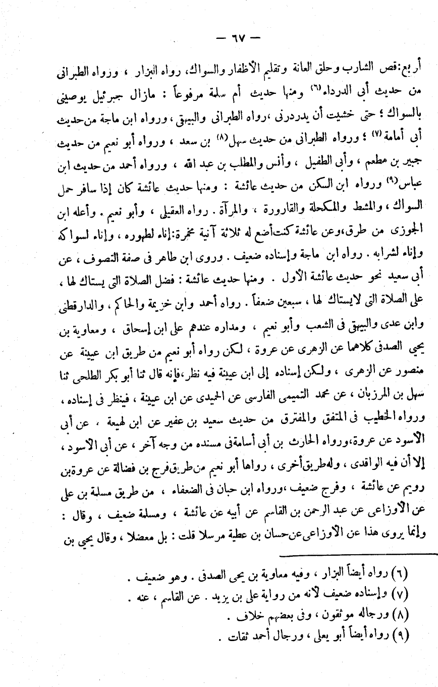 أربع قص الشارب وحلق العانة وتقليم الأظفار والسواك رواه البزار ورواه الطبراني من حديث أبي الدرداء 6 ومنها حديث أم سلمة مرفوعا ما زال جبرائيل يوصيني بالسواك حتى خشيت أن يدردرني رواه الطبراني والبيهقي ورواه بن ماجة من حديث أبي أمامة 7 ورواه الطبراني من حديث سهل بن سعد ورواه أبو نعيم من حديث جبير بن مطعم وأبي الطفيل وأنس والمطلب بن عبد الله ورواه أحمد من حديث بن عباس 9 ورواه بن السكن من حديث عائشة ومنها حديث عائشة كان إذا سافر حمل السواك والمشط والمكحلة والقارورة والمرآة رواه العقيلي وأبو نعيم وأعله بن الجوزي من طرق وعن عائشة كنت أضع له ثلاثة آنية مخمرة إناء لطهوره وإناء لسواكه وإناء لشرابه رواه بن ماجة وإسناده ضعيف وروى بن طاهر في صفة التصوف عن أبي سعيد نحو حديث عائشة الأول ومنها حديث عائشة فضل الصلاة التي يستاك لها على الصلاة التي لا يستاك لها سبعين ضعفا رواه أحمد وابن خزيمة والحاكم والدارقطني وابن عدي والبيهقي في الشعب وأبو نعيم ومداره عندهم على بن إسحاق ومعاوية بن يحيى الصدفي كلاهما عن الزهري عن عروة لكن رواه أبو نعيم من طريق بن عيينة عن منصور عن الزهري ولكن إسناده إلى بن عيينة فيه نظر فإنه قال ثنا أبو بكر الطلحي ثنا سهل بن المرزبان عن محمد التميمي الفارسي عن الحميدي عن بن عيينة فينظر في إسناده ورواه الخطيب في المتفق والمفترق من حديث سعيد بن عفير عن بن لهيعة عن أبي الأسود عن عروة ورواه الحارث بن أبي أسامة في مسنده من وجه آخر عن أبي الأسود إلا أن في الواقدي وله طريق أخرى رواها أبو نعيم من طريق فرج بن فضالة عن عروة بن رويم عن عائشة وفرج ضعيف ورواه بن حبان في الضعفاء من طريق مسلمة بن علي عن الوزاعي عن عبد الرحمن بن القاسم عن أبيه عن عائشة ومسلمة ضعيف وقال وإنما يروى هذا عن الأوزاعي عن حسان بن عطية مرسلا قلت بل معضلا وقال يحيى بن