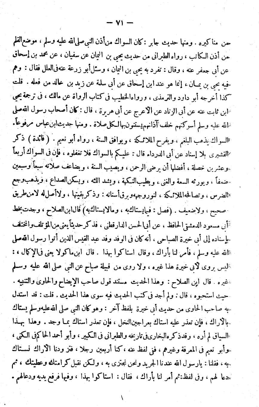 فائدة ذكر القشيري بلا إسناد عن أبي الدرداء قال عليكم بالسواك فلا تغفلوه فإن في السواك أربعا وعشرين خصلة أفضلها أن يرضي الرحمن ويصيب السنة ويضاعف صلاته سبعا وسبعين ضعفا ويورثه السعة والغنى ويطيب النكهة ويشد اللثة ويسكن الصداع ويذهب وجع الضرس وتصافحه الملائكة لنور وجهه وبرق أسنانه وذكر بقيتها ولا أصل له لا من طريق صحيح ولا ضعيف فصل فيما يستاك به ومالا يستاك به قال بن الصلاح وجدت بخط أبي مسعود الدمشقي الحافظ عن أبي الحسن الدارقطني فذكر حديثا يعني من المؤتلف والمختلف بإسناده إلى أبي خيرة الصباحي أنه كان في الوفد وفد عبد القيس الذين أتوا رسول الله صلى الله عليه و سلم فأمر لنا بأراك وقال استاكوا بهذا قال بن ماكولا يعني في الإكمال ليس يروى لأبي خيرة هذا غيره ولا روي من قبيلة صباح عن النبي صلى الله عليه و سلم غيره قال بن الصلاح وهذا الحديث مستند قول صاحب الإيضاح والحاوي والتنبيه حيث استحبوه قال ولم أجد في كتب الحديث فيه سوى هذا الحديث قلت قد استدل به صاحب الحاوي من حديث أبي خيرة بلفظ آخر وهو كان النبي صلى الله عليه و سلم يستاك بالأراك فإن تعذر عليه استاك بعراجين النخل فإن تعذر استاك بما وجد وهذا بهذا السياق لم أره وقد ذكره البخاري في تاريخه والطبراني في الكبير وأبو أحمد الحاكم في الكنى وأبو نعيم في المعرفة وغيرهم ففي لفظ عنه كنا أربعين رجلا فتزودنا الأراك نستاك به فقلنا يا رسول الله عندنا الجريد ونحن نجتزي به ولكن نقبل كرامتك وعطيتك ثم دعا لهم وفي لفظ ثم أمر لنا بأراك فقال استاكوا بهذا وفيها فرفع يديه ودعا لهم