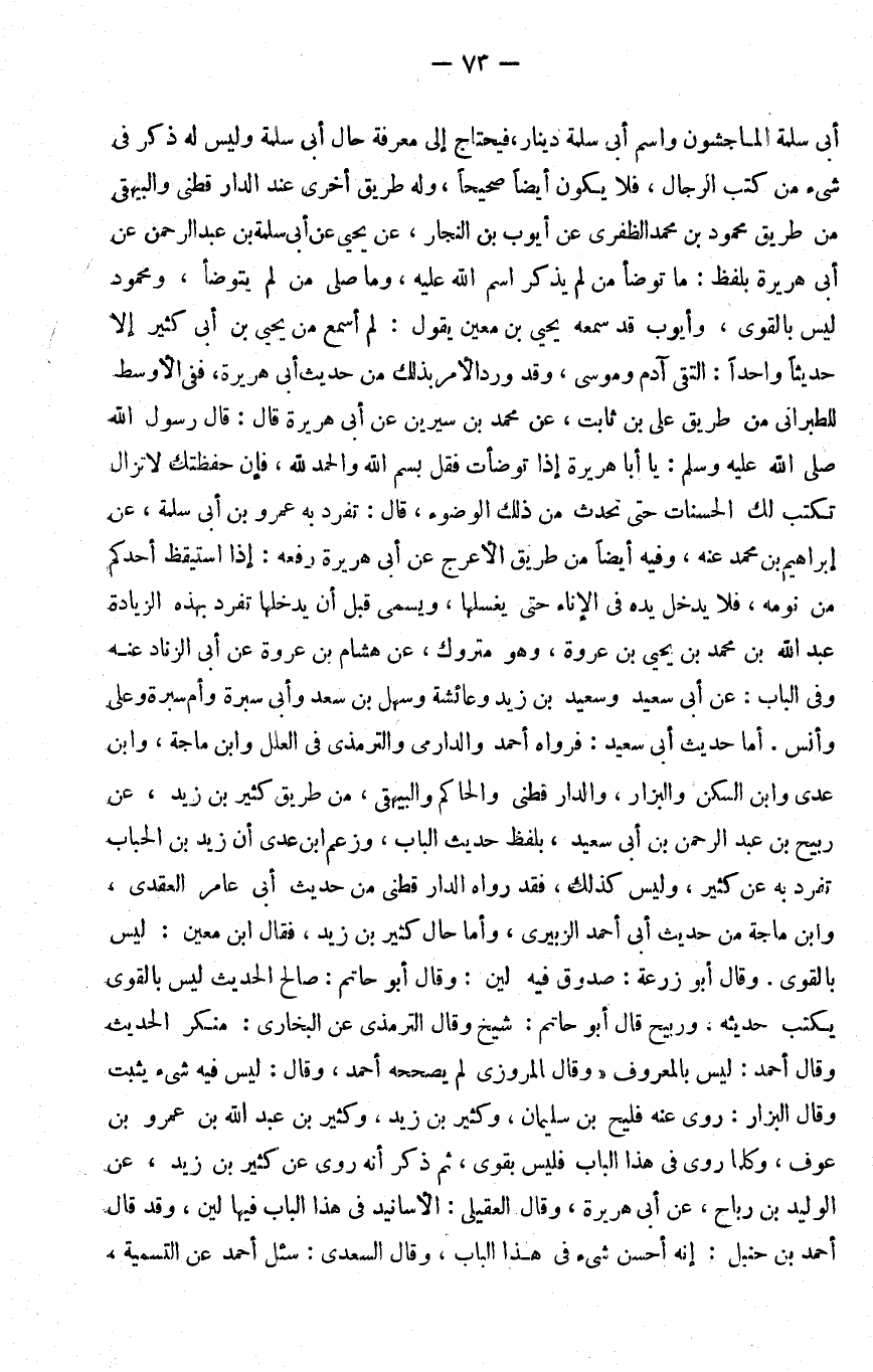 أبي سلمة الماجشون واسم أبي سلمة دينار فيحتاج إلى معرفة حال أبي سلمة وليس له ذكر في شيء من كتب الرجال فلا يكون أيضا صحيحا وله طريق أخرى عند الدارقطني والبيهقي من طريق محمود بن محمد الظفري عن أيوب بن النجار عن يحيى عن أبي سملة بن عبد الرحمن عن أبي هريرة بلفظ ما توضأ من لم يذكر اسم الله عليه وما صلى من لم يتوضأ ومحمود ليس بالقوي وأيوب قد سمعه يحيى بن معين يقول لم أسمع من يحيى بن أبي كثير إلا حديثا واحدا التقى آدم وموسى وقد ورد الأمر بذلك من حديث أبي هريرة ففي الأوسط للطبراني من طريق علي بن ثابت عن محمد بن سيرين عن أبي هريرة قال قال رسول الله صلى الله عليه و سلم يا أبا هريرة إذا توضأت فقل بسم الله والحمد لله فإن حفظتك لا تزال تكتب لك الحسنات حتى تحدث من ذلك الوضوء قال تفرد به عمرو بن أبي سلمة عن إبراهيم بن محمد عنه وفيه أيضا من طريق الأعرج عن أبي هريرة رفعه إذا استيقظ أحدكم من نومه فلا يدخل يده في الإناء حتى يغسلها ويسمي قبل أن يدخلها تفرد بهذه الزيادة عبد الله بن محمد بن يحيى بن عروة وهو متروك عن هشام بن عروة عن أبي الزناد عنه وفي الباب عن أبي سعيد وسعيد بن زيد وعائشة وسهل بن سعد وأبي سبرة وأم سبرة وعلي وأنس أما حديث أبي سعيد فرواه أحمد والدارمي والترمذي في العلل وابن ماجة وابن عدي وابن السكن والبزار والدارقطني والحاكم والبيهقي من طريق كثير بن زيد عن ربيح بن عبد الرحمن بن أبي سعيد بلفظ حديث الباب وزعم بن عدي أن زيد بن الحباب تفرد به عن كثير وليس كذلك فقد رواه الدارقطني من حديث أبي عامر العقدي وابن ماجة من حديث أبي أحمد الزبيري وأما حال كثير بن زيد فقال بن معين ليس بالقوي وقال أبو زرعة صدوق فيه لين وقال أبو حاتم صالح الحديث ليس بالقوي يكتب حديثه وربيح قال أبو حاتم شيخ وقال الترمذي عن البخاري منكر الحديث وقال أحمد ليس بالمعروف وقال المروزي لم يصححه أحمد وقال ليس فيه شيء يثبت وقال البزار روى عنه فليح بن سليمان وكثير بن زيد وكثير بن عبد الله بن عمرو بن عوف وكلما روى في هذا الباب فليس بقوي ثم ذكر أنه روى عن كثير بن زيد عن الوليد بن رباح عن أبي هريرة وقال العقيلي الأسانيد في هذا الباب فيها لين وقد قال أحمد بن حنبل إنه أحسن شيء في هذا الباب وقال السعدي سئل أحمد عن التسمية