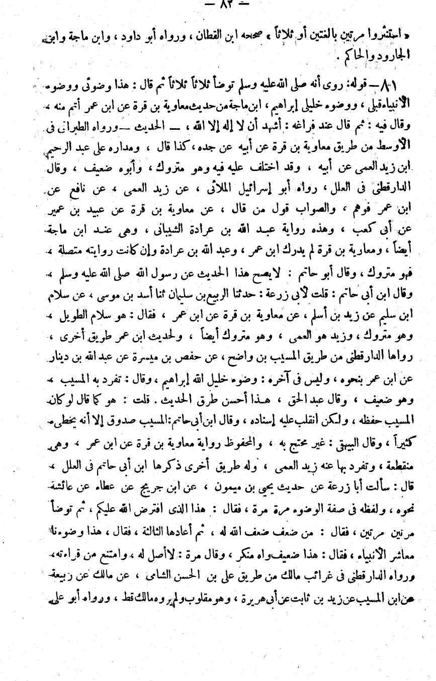 81 - قوله روي أنه صلى الله عليه و سلم توضأ ثلاثا ثلاثا ثم قال هذا وضوئي ووضوء الأنبياء قبلي ووضوء خليلي إبراهيم بن ماجة من حديث معاوية بن قرة عن بن عمر أتم منه وقال فيه ثم قال عند فراغه أشهد أن لا إله إلا الله الحديث ورواه الطبراني في الأوسط من طريق معاوية بن قرة عن أبيه عن جده كذا قال ومداره على عبد الرحيم بن زيد العمى عن أبيه وقد اختلف عليه فيه وهو متروك وأبوه ضعيف وقال الدارقطني في العلل رواه أبو إسرائيل الملائي عن زيد العمى عن نافع عن بن عمر فوهم والصواب قول من قال عن معاوية بن قرة عن عبيد بن عمير عن أبي كعب وهذه رواية عبد الله بن عرادة الشيباني وهي عند بن ماجة أيضا ومعاوية بن قرة لم يدرك بن عمر وعبد الله بن عرادة وإن كانت روايته متصلة فهو متروك وقال أبو حاتم لا يصح هذا الحديث عن رسول الله صلى الله عليه و سلم وقال بن أبي حاتم قلت لأبي زرعة حدثنا الربيع بن سليمان ثنا أسد بن موسى عن سلام بن سليم عن زيد بن أسلم عن معاوية بن قرة عن بن عمر فقال هو سلام الطويل وهو متروك وزيد هو العمى وهو متروك أيضا ولحديث بن عمر طريق أخرى رواها الدارقطني من طريق المسيب بن واضح عن حفص بن ميسرة عن عبد الله بن دينار عن بن عمر بنحوه وليس في آخره وضوء خليل الله إبراهيم وقال تفرد به السميب وهو ضعيف وقال عبد الحق هذا أحسن طرق الحديث قلت هو كما قال لو كان المسيب حفظه ولكن انقلب عليه إسناده وقال بن أبي حاتم المسيب صدوق إلا أنه يخطىء كثيرا وقال البيهقي غير محتج به والمحفوظ رواية معاوية بن قرة عن بن عمر وهي منقطعة وتفرد بها عنه زيد العمى وله طريق أخرى ذكرها بن أبي حاتم في العلل قال سألت أبا رزعة عن حديث يحيى بن ميمون عن بن جريج عن عطاء عن عائشة نحوه ولفظه في صفة الوضوء مرة مرة فقال هذا الذي افترض الله عليكم ثم توضأ مرتين مرتين فقال من ضعف ضعف الله له ثم أعادها الثالثة فقال هذا وضوءنا معاشر الأنبياء فقال هذا ضعيف واه منكر وقال مرة لا أصل له وامتنع من قراءته ورواه الدارقطني في غرائب مالك من طريق علي بن الحسن الشامي عن مالك عن ربيعة عن بن المسيب عن زيد بن ثابت عن أبي هريرة وهو مقلوب ولم يروه مالك قط ورواه أبو علي