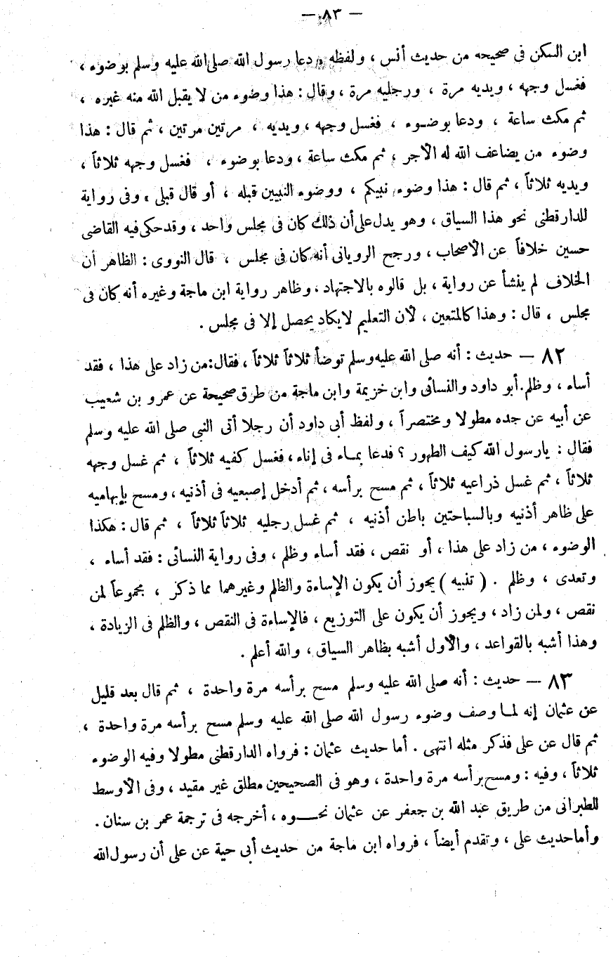 82 - حديث أنه صلى الله عليه و سلم توضأ ثلاثا ثلاثا فقال من زاد على هذا فقد أساء وظلم أبو داود والنسائي وابن خزيمة وابن ماجة من طرق صحيحة عن عمرو بن شعيب عن أبيه عن جده مطولا ومختصرا ولفظ أبي داود أن رجلا أتى النبي صلى الله عليه و سلم فقال يا رسول الله كيف الطهور فدعا بماء في إناء فغسل كفيه ثلاثا ثم غسل وجهه ثلاثا ثم غسل ذراعيه ثلاثا ثم مسح برأسه ثم أدخل إصبعيه في أذنيه ومسح بإبهاميه على ظاهر أذنيه وبالسباحتين باطن أذنيه ثم غسل رجليه ثلاثا ثلاثا ثم قال هكذا الوضوء من زاد على هذا أو نقص فقد أساء وظلم وفي رواية النسائي فقد أساء وتعدى وظلم
