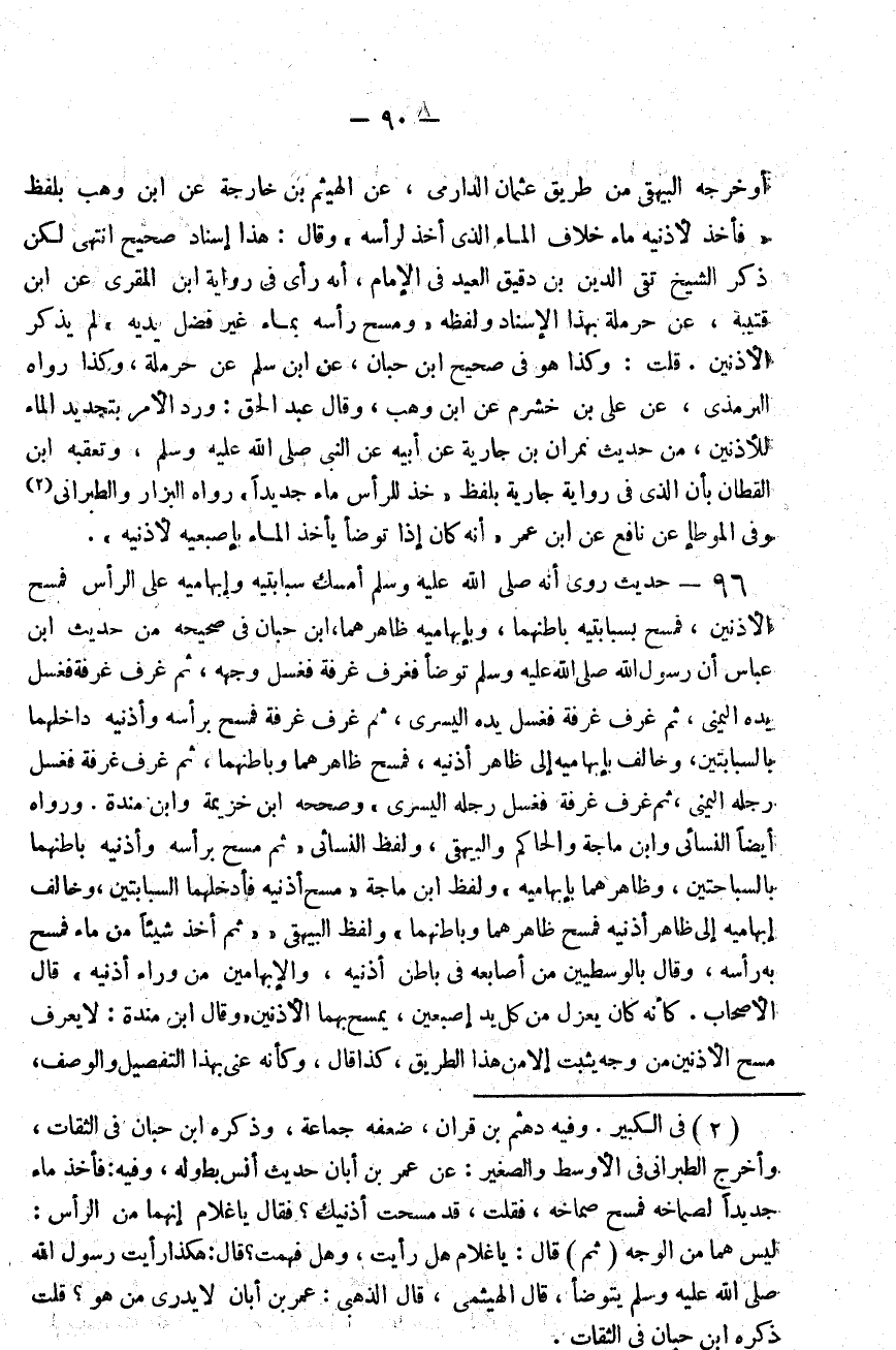 96 - حديث روي أنه صلى الله عليه و سلم أمسك سبابتيه وإبهاميه على الرأس فمسح الأذنين فمسح بسبابتيه باطنهما وبإبهاميه ظاهرهما بن حبان في صحيحه من حديث بن عباس أن رسول الله صلى الله عليه و سلم توضأ فغرف غرفة فغسل وجهه ثم غرف غرفة فغسل يده اليمنى ثم غرف غرفة فغسل يده اليسرى ثم غرف غرفة فمسح برأسه وأذنيه داخلهما بالسبابتين وخالف بإبهاميه إلى ظاهر أذنيه فمسح ظاهرهما وباطنهما ثم غرف غرفة فغسل رجله اليمنى ثم غرف غرفة فغسل رجله اليسرى وصححه بن خزيمة وابن مندة ووراه أيضا النسائي وابن ماجة والحاكم والبيهقي ولفظ النسائي ثم مسح برأسه وأذنيه باطنهما بالسباحتين وظاهرهما بإبهاميه ولفظ بن ماجة مسح أذنيه فأدخلهما السبابتين وخالف إبهاميه إلى ظاهر أذنيه فمسح ظاهرهما وباطنهما ولفظ البيهقي ثم أخذ شيئا من ماء فمسح به رأسه وقال بالوسطيين من أصابعه في باطن أذنيه والإبهامين من وراء أذنيه قال الأصحاب كأنه كان يعزل من كل يد إصبعين يمسح بهما الأذنين وقال بن مندة لا يعرف مسح الأذنين من وجه يثبت إلا من هذا الطريق كذا قال وكأنه عنى بهذا التفصيل والوصف