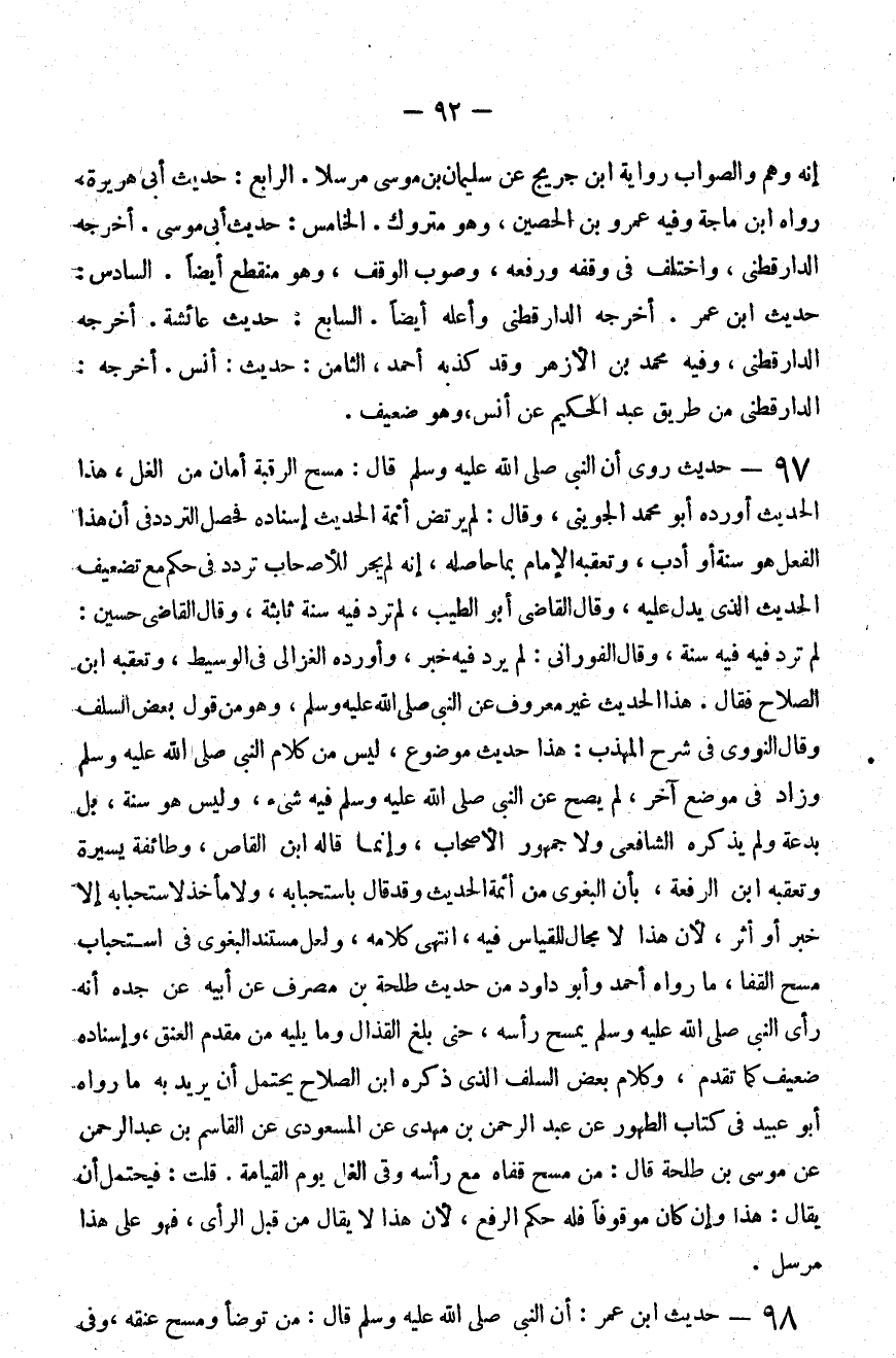 97 - حديث روي أن النبي صلى الله عليه و سلم قال مسح الرقبة أمان من الغل هذا الحديث أورده أبو محمد الجويني وقال لم يرتض أئمة الحديث إسناده فحصل التردد في أن هذا الفعل هو سنة أو أدب وتعقبه الإمام بما حاصله إنه لم يجر للأصحاب تردد في حكم مع تضعيف الحديث الذي يدل عليه وقال القاضي أبو الطيب لم ترد فيه سنة ثابتة وقال القاضي حسين لم ترد فيه سنة وقال الفوراني لم يرد فيه خبر وأورده الغزالي في الوسيط وتعقبه بن الصلاح فقال هذا الحديث غير معروف عن النبي صلى الله عليه و سلم وهو من قول بعض السلف وقال النووي في شرح المهذب هذا حديث موضوع ليس من كلام النبي صلى الله عليه و سلم وزاد في موضع آخر لم يصح عن النبي صلى الله عليه و سلم فيه شيء وليس هو سنة بل بدعة ولم يذكره الشافعي ولا جمهور الأصحاب وإنما قاله بن القاص وطائفة يسيرة وتعقبه بن الرفعة بأن البغوي من أئمة الحديث وقد قال باستحبابه ولا مأخذ لاستحبابه إلا خبر أو أثر لأن هذا لا مجال للقياس فيه انتهى كلامه ولعل مستند البغوي في استحباب مسح القفا ما رواه أحمد وأبو داود من حديث طلحة بن مصرف عن أبيه عن جده أنه رأى النبي صلى الله عليه و سلم يمسح رأسه حتى بلغ القذال وما يليه من مقدم العنق وإسناده ضعيف كما تقدم وكلام بعض السلف الذي ذكره بن الصلاح يحتمل أن يريد به ما رواه أبو عبيد في كتاب الطهور عن عبد الرحمن بن مهدي عن المسعودي عن القاسم بن عبد الرحمن عن موسى بن طلحة قال من مسح قفاه مع رأسه وقي