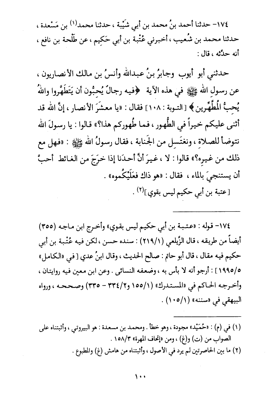 174 - حَدَّثَنَا أَحْمَدُ بْنُ مُحَمَّدِ بْنِ أَبِي شَيْبَةَ , نا مُحَمَّدُ بْنُ مَسْعَدَةَ , نا مُحَمَّدُ بْنُ شُعَيْبٍ , أَخْبَرَنِي عُتْبَةُ بْنُ أَبِي حَكِيمٍ , عَنْ طَلْحَةَ بْنِ نَافِعٍ أَنَّهُ حَدَّثَهُ , حَدَّثَنِي أَبُو أَيُّوبَ , وَجَابِرُ بْنُ عَبْدِ اللَّهِ , وَأَنَسُ بْنُ مَالِكٍ الْأَنْصَارِيُّونِ , عَنْ رَسُولِ اللَّهِ صَلَّى اللهُ عَلَيْهِ وَسَلَّمَ فِي هَذِهِ الْآيَةِ {فِيهِ رِجَالٌ يُحِبُّونَ أَنْ يَتَطَهَّرُوا وَاللَّهُ يُحِبُّ الْمُطَّهِّرِينَ} [التوبة: 108] , فَقَالَ: «يَا مَعْشَرَ الْأَنْصَارِ إِنَّ اللَّهَ قَدْ أَثْنَى عَلَيْكُمْ خَيْرًا فِي الطَّهُورِ , §فَمَا طُهُورُكُمْ هَذَا؟» , قَالُوا: يَا رَسُولَ اللَّهِ نَتَوَضَّأُ لِلصَّلَاةِ وَنَغْتَسِلُ مِنَ الْجَنَابَةِ , فَقَالَ رَسُولُ اللَّهِ صَلَّى اللهُ عَلَيْهِ وَسَلَّمَ: «فَهَلْ مَعَ ذَلِكَ مِنْ غَيْرِهِ؟» , قَالُوا: لَا، غَيْرَ أَنَّ أَحَدَنَا إِذَا خَرَجَ مِنَ الْغَائِطِ أَحَبَّ أَنْ يَسْتَنْجِيَ بِالْمَاءِ , فَقَالَ: «هُوَ ذَلِكَ فَعَلَيْكُمُوهُ». عُتْبَةُ بْنُ أَبِي حَكِيمٍ لَيْسَ بِقَوِيٍّ