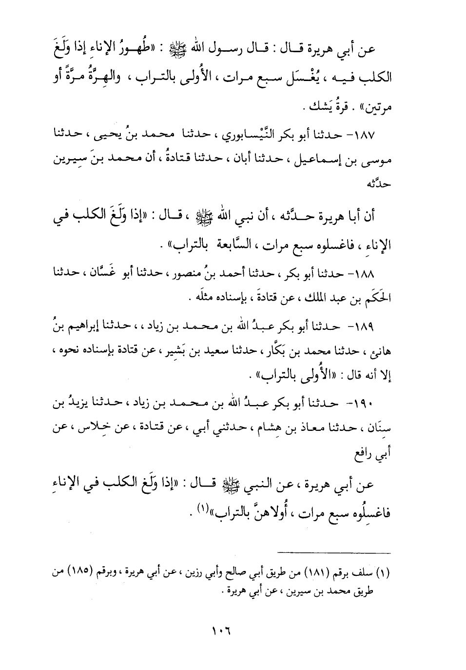 187 - حَدَّثَنَا أَبُو بَكْرٍ النَّيْسَابُورِيُّ , نا مُحَمَّدُ بْنُ يَحْيَى , نا مُوسَى بْنُ إِسْمَاعِيلَ , نا أَبَانُ , نا قَتَادَةُ , أَنَّ مُحَمَّدَ بْنَ سِيرِينَ حَدَّثَهُ , أَنَّ أَبَا هُرَيْرَةَ حَدَّثَهُ , أَنَّ نَبِيَّ اللَّهِ صَلَّى اللهُ عَلَيْهِ وَسَلَّمَ قَالَ: § «إِذَا وَلَغَ الْكَلْبُ فِي الْإِنَاءِ فَاغْسِلُوهُ سَبْعَ مَرَّاتٍ السَّابِعَةَ بِالتُّرَابِ». وَهَذَا صَحِيحٌ.