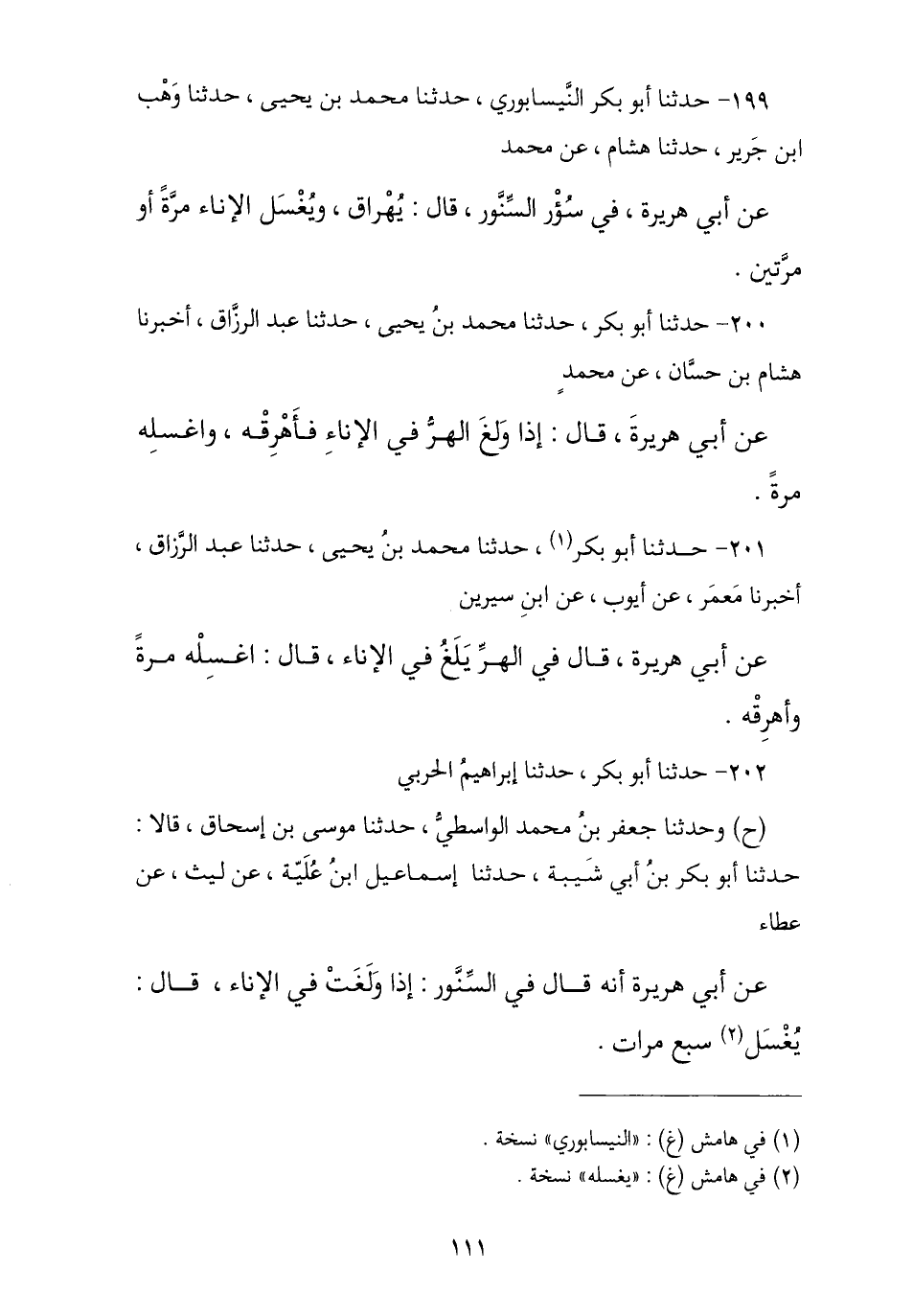 199 - حَدَّثَنَا أَبُو بَكْرٍ النَّيْسَابُورِيُّ , نا مُحَمَّدُ بْنُ يَحْيَى , أنا وَهْبُ بْنُ جَرِيرٍ , نا هِشَامٌ , عَنْ مُحَمَّدٍ , عَنْ أَبِي هُرَيْرَةَ «فِي §سُؤْرِ الْهِرِّ يُهَرَاقُ وَيُغْسَلُ الْإِنَاءُ مَرَّةً أَوْ مَرَّتَيْنِ». مَوْقُوفٌ