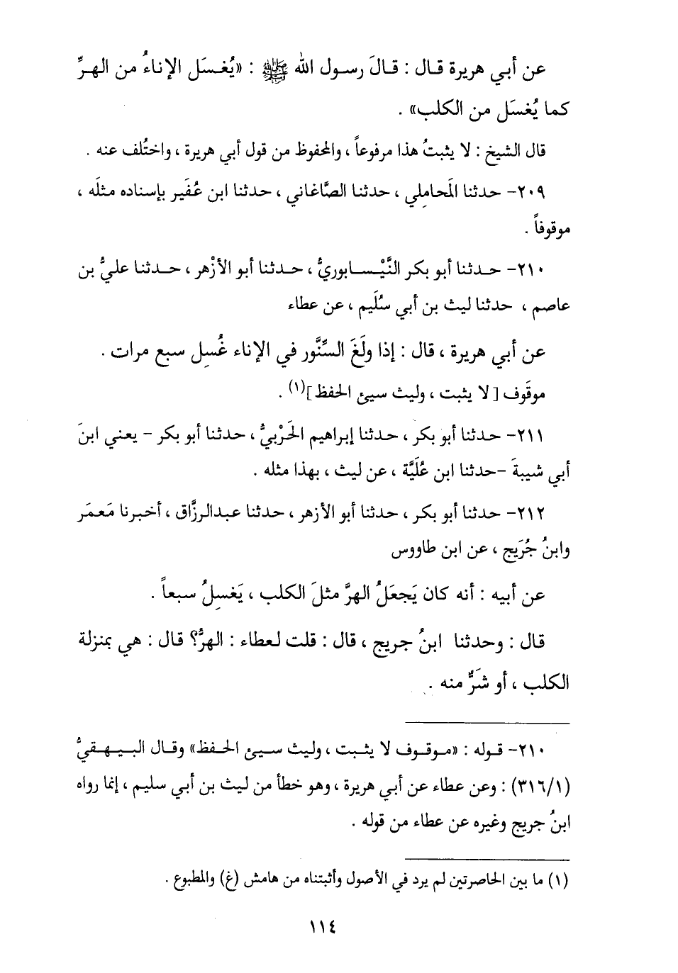 210 - حَدَّثَنَا أَبُو بَكْرٍ النَّيْسَابُورِيُّ , نا أَبُو الْأَزْهَرِ , نا عَلِيُّ بْنُ عَاصِمٍ , نا لَيْثُ بْنُ أَبِي سُلَيْمٍ , عَنْ عَطَاءٍ , عَنْ أَبِي هُرَيْرَةَ , قَالَ: § «إِذَا وَلَغَ السِّنَّوْرُ فِي الْإِنَاءِ غُسِلَ سَبْعَ مَرَّاتٍ». مَوْقُوفٌ لَا يُثْبَتُ , وَلَيْثٌ سِيءَ الْحِفْظِ.