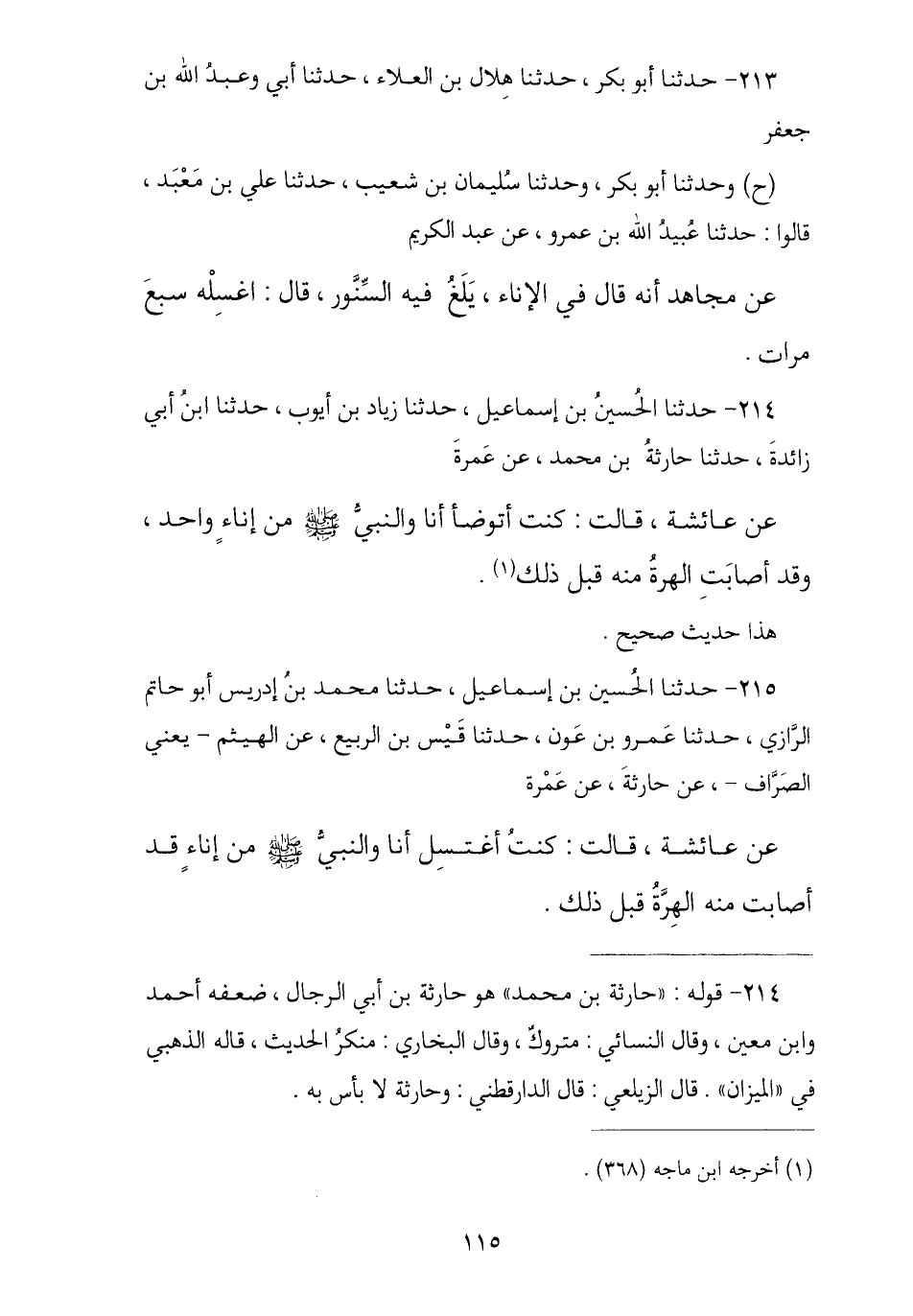 214 - نا الْحُسَيْنُ بْنُ إِسْمَاعِيلَ , نا زِيَادُ بْنُ أَيُّوبَ , نا ابْنُ أَبِي زَائِدَةَ , نا حَارِثَةُ بْنُ مُحَمَّدٍ , عَنْ عَمْرَةَ , عَنْ عَائِشَةَ , قَالَتْ: § «كُنْتُ أَتَوَضَّأُ أَنَا وَرَسُولُ اللَّهِ صَلَّى اللهُ عَلَيْهِ وَسَلَّمَ مِنْ إِنَاءٍ وَاحِدٍ وَقَدْ أَصَابَتْ مِنْهُ الْهِرَّةُ قَبْلَ ذَلِكَ»