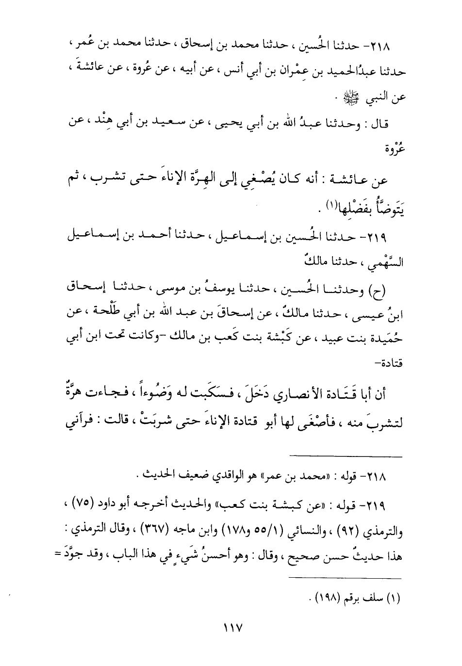 219 - نا الْحُسَيْنُ بْنُ إِسْمَاعِيلَ , نا أَحْمَدُ بْنُ إِسْمَاعِيلَ السَّهْمِيُّ , نا مَالِكٌ , وَثنا الْحُسَيْنُ , نا يُوسُفُ بْنُ مُوسَى , نا إِسْحَاقُ بْنُ عِيسَى , نا مَالِكٌ , عَنْ إِسْحَاقَ بْنِ عَبْدِ اللَّهِ بْنِ أَبِي طَلْحَةَ , عَنْ حُمَيْدَةَ بِنْتِ عُبَيْدٍ , عَنْ كَبْشَةَ بِنْتِ كَعْبِ بْنِ مَالِكٍ , وَكَانَتْ تَحْتَ ابْنِ أَبِي قَتَادَةَ , أَنَّ أَبَا قَتَادَةَ الْأَنْصَارِيَّ , دَخَلَ فَسَكَبْتُ لَهُ وُضُوءًا فَجَاءَتْ هِرَّةٌ لِتَشْرَبَ مِنْهُ فَأَصْغَى لَهَا أَبُو قَتَادَةَ الْإِنَاءَ حَتَّى شَرِبَتْ , قَالَ: فَرَآنِي -[118]- أَنْظُرُ إِلَيْهِ , قَالَ: أَتَعْجَبِينَ يَا ابْنَةَ أَخِي؟ , قَالَتْ: قُلْتُ: نَعَمْ , ثُمَّ قَالَ: إِنَّ رَسُولَ اللَّهِ صَلَّى اللهُ عَلَيْهِ وَسَلَّمَ قَالَ: «إِنَّهَا §لَيْسَتْ بِنَجَسٍ إِنَّهَا مِنَ الطَّوَّافِينَ عَلَيْكُمْ وَالطَّوَّافَاتِ»