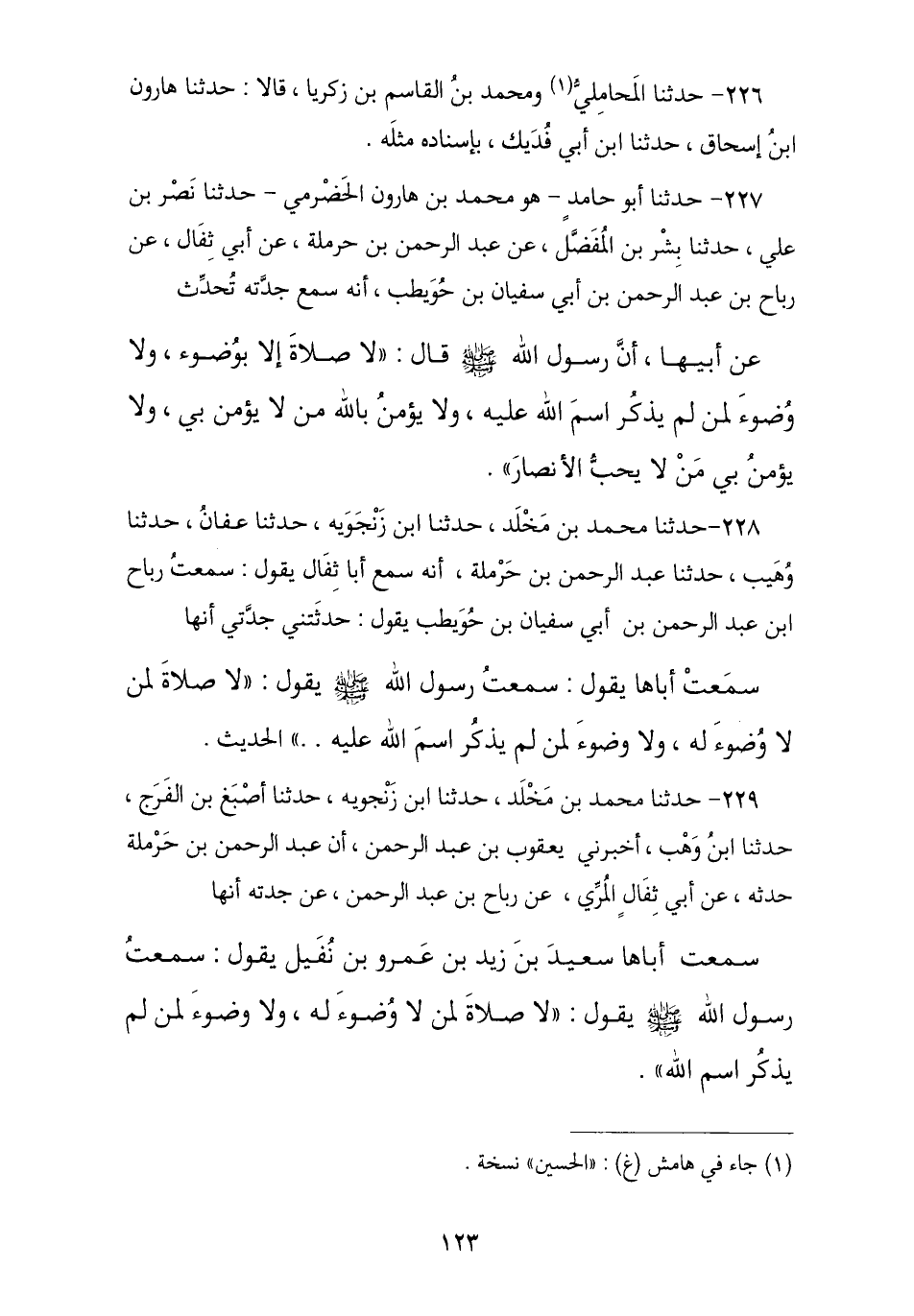 228 - حَدَّثَنَا مُحَمَّدُ بْنُ مَخْلَدٍ , نا ابْنُ زَنْجُوَيْهِ أَبُو بَكْرٍ , نا عَفَّانُ , نا وُهَيْبٌ , نا عَبْدُ الرَّحْمَنِ بْنُ حَرْمَلَةَ , أَنَّهُ قَالَ: سَمِعَ أَبَا ثِفَالٍ , يَقُولُ: سَمِعْتُ رَبَاحَ بْنَ عَبْدِ الرَّحْمَنِ بْنِ أَبِي سُفْيَانَ بْنِ حُوَيْطِبٍ , يَقُولُ: حَدَّثَتْنِي جَدَّتِي , أَنَّهَا سَمِعَتْ أَبَاهَا , يَقُولُ: سَمِعْتُ رَسُولَ اللَّهِ صَلَّى اللهُ عَلَيْهِ وَسَلَّمَ يَقُولُ: § «لَا صَلَاةَ لِمَنْ لَا وُضُوءَ لَهُ , وَلَا وُضُوءَ لِمَنْ لَمْ يَذْكُرِ اسْمَ اللَّهِ عَلَيْهِ» , الْحَدِيثَ